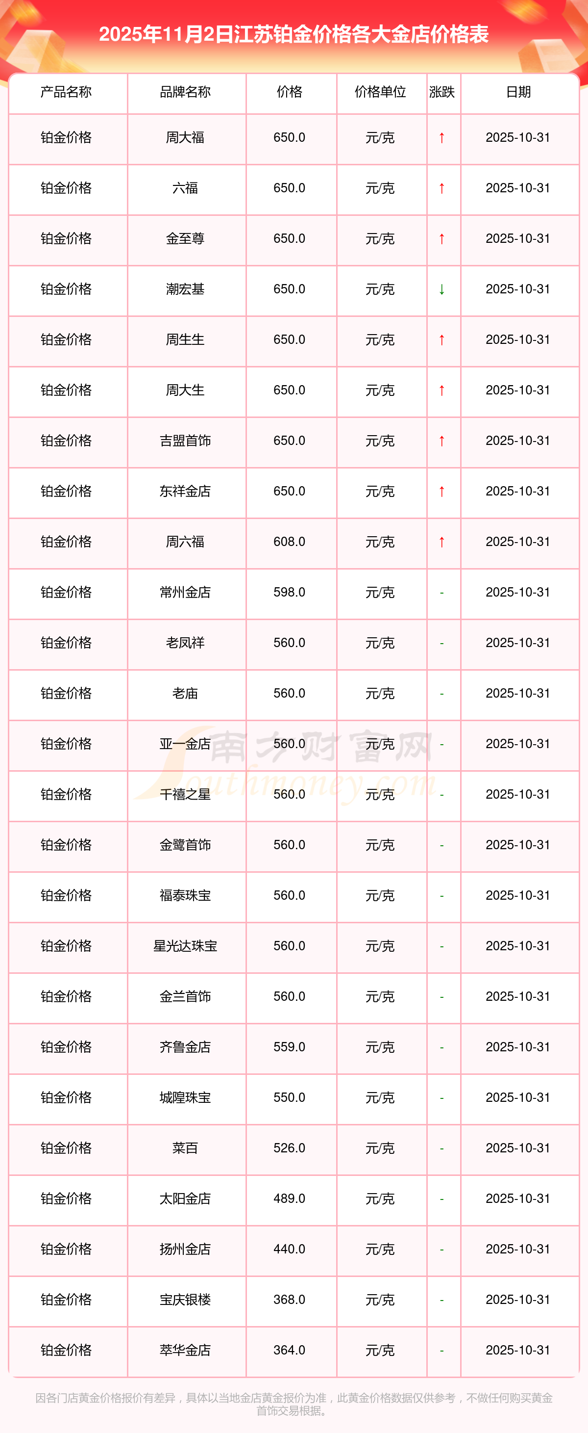 2025年11月2日江蘇各金店鉑金價(jià)格是多少錢一克?各金店鉑金價(jià)格表公布