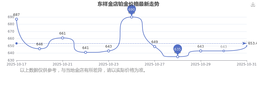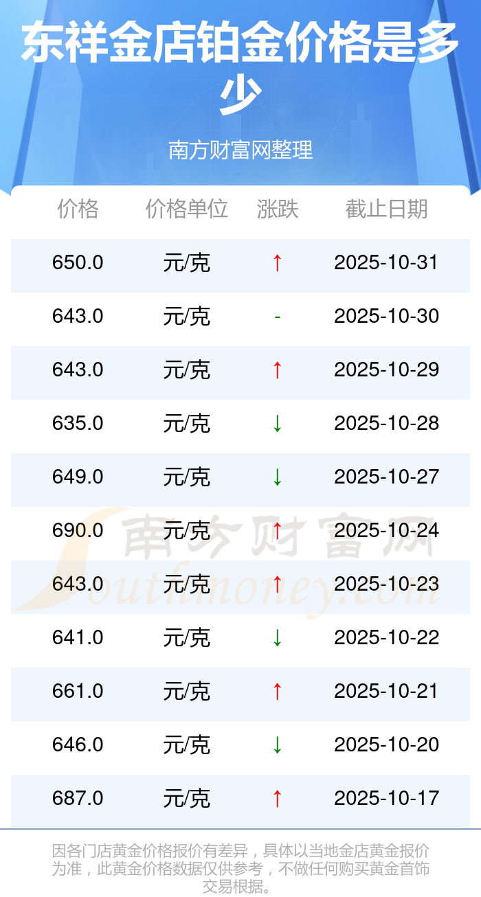 當(dāng)下,東祥金店 鉑金價(jià)格今日的最新價(jià)格是650.0元/克。