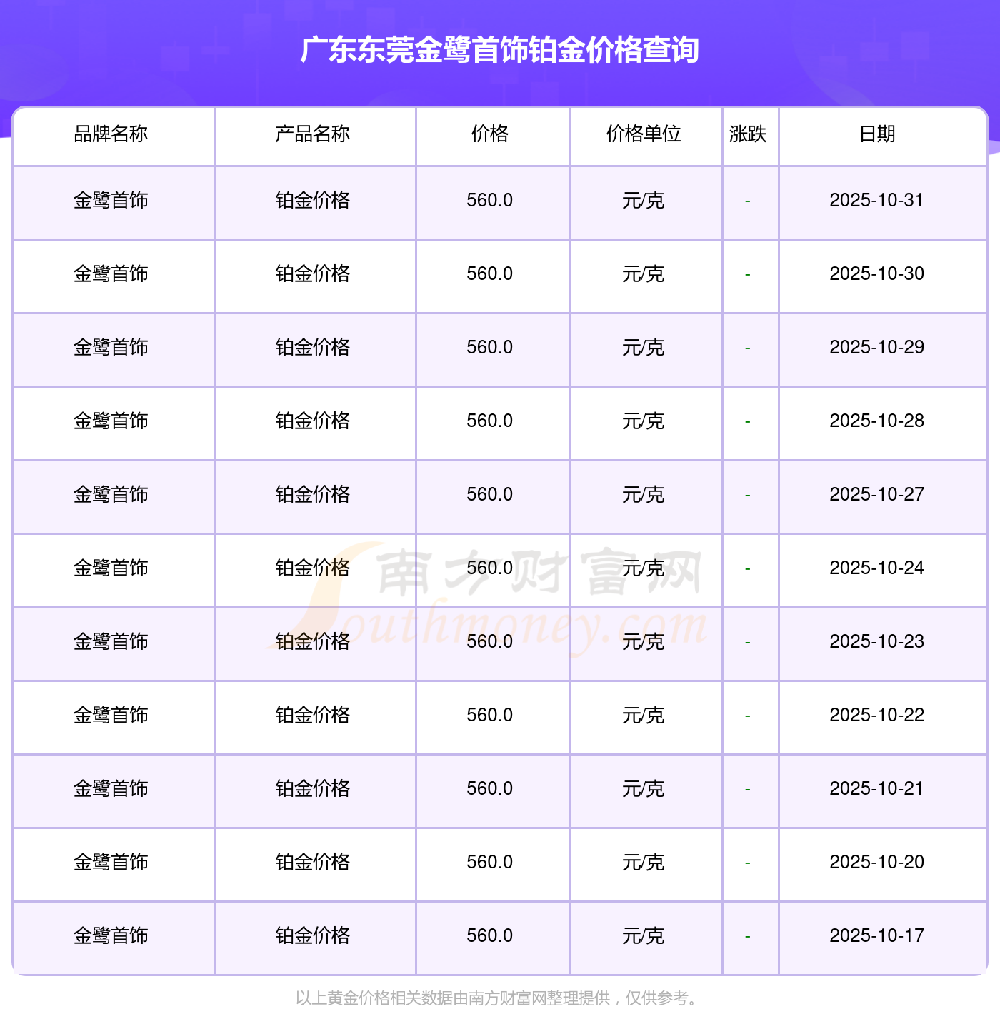 廣東東莞金鷺首飾的鉑金價(jià)格在今日(2025年11月2日),每克售價(jià)為560.0元/克。