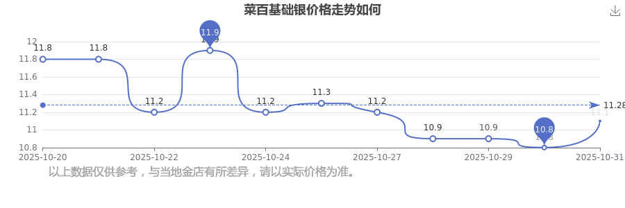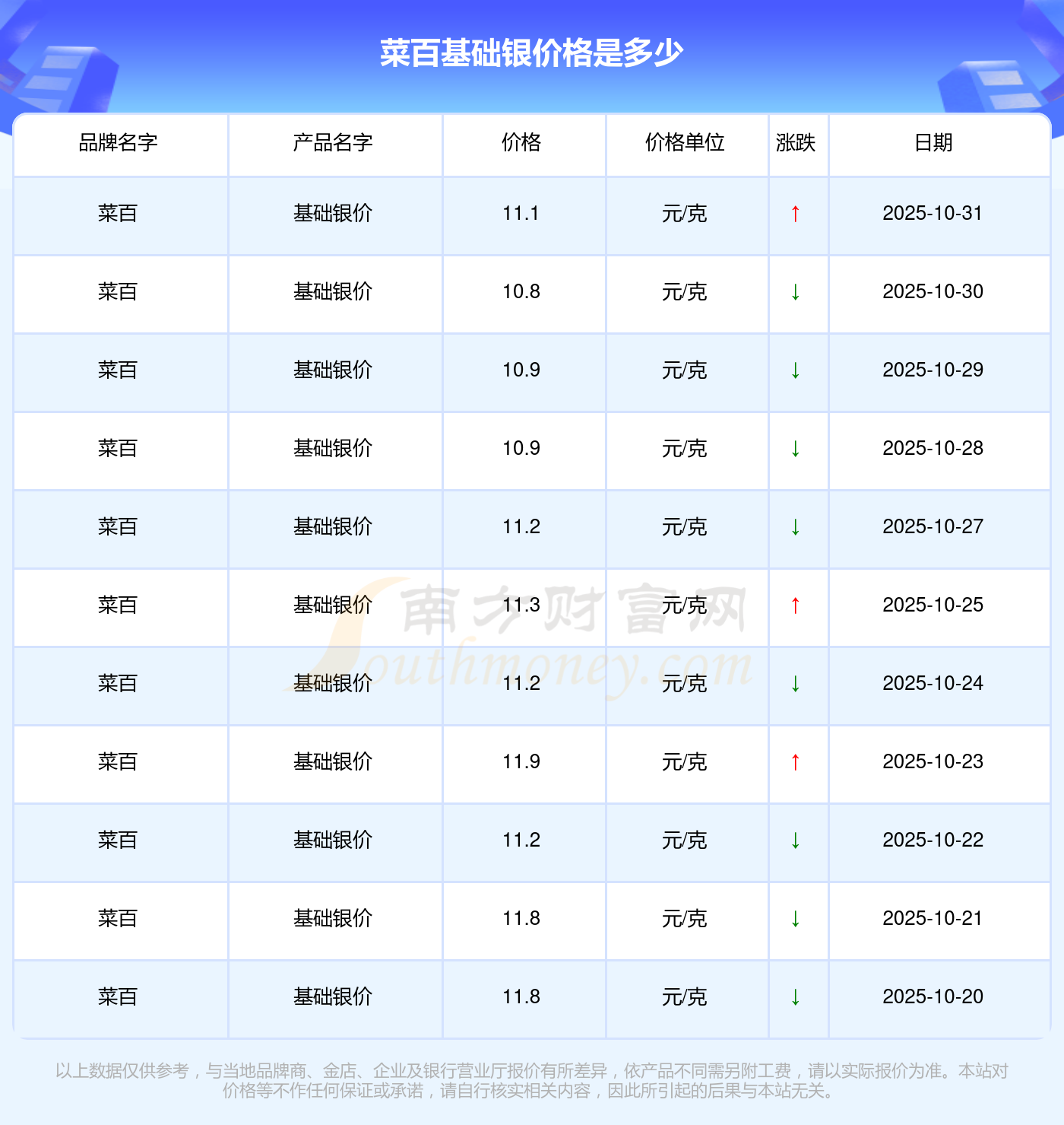 今日菜百 基礎(chǔ)銀價(jià)最新的克重售價(jià)為11.1元/克。