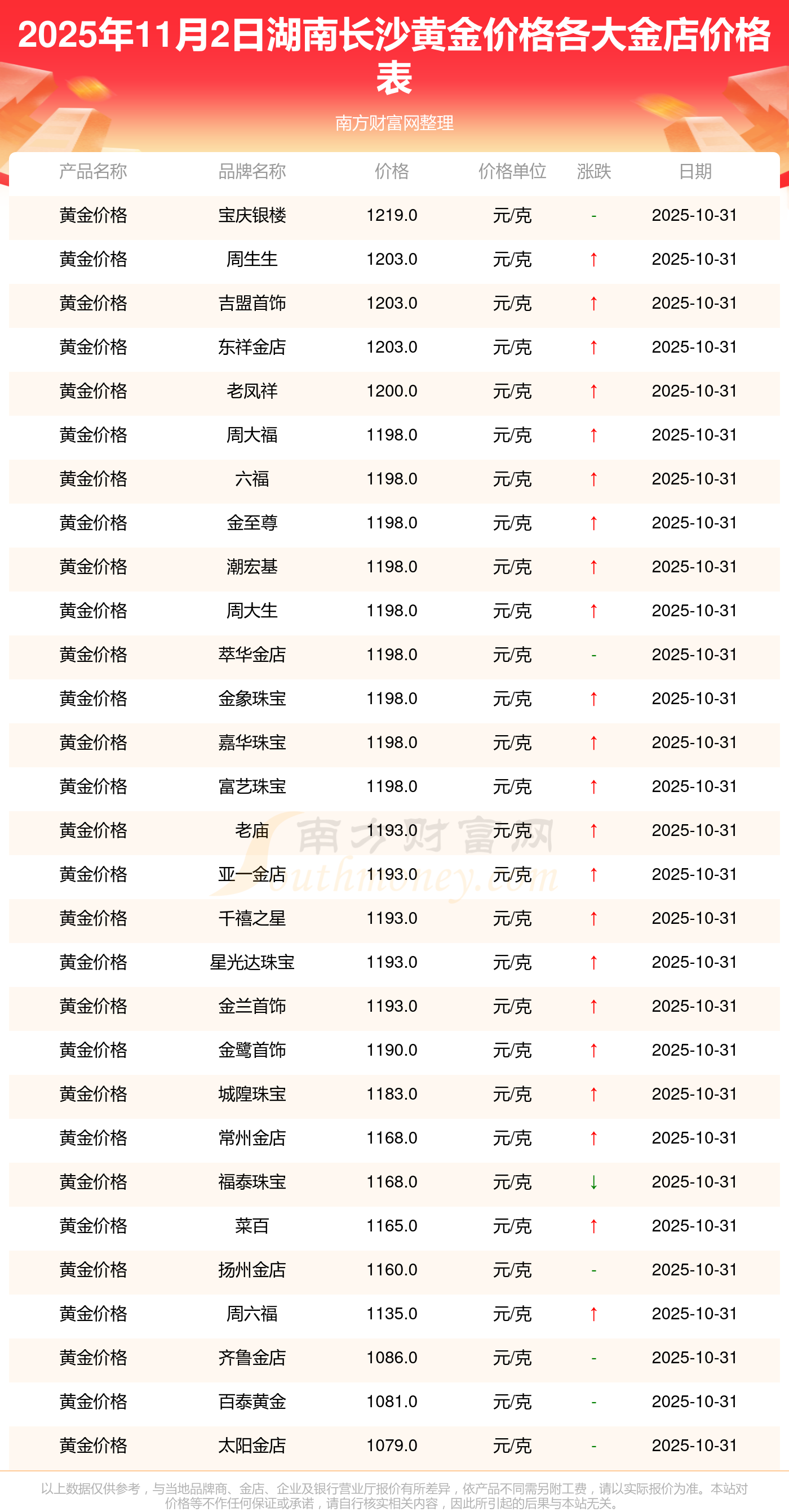 2025年11月2日湖南長沙各大金店黃金價格最新價格查詢來了:周大福1198.0元/克,周大福650.0元/克,周大福1198.0元/克,周大福44660.0,周大福18640.0,周大福40080.0,周大福1058.0元/克,老鳳祥1200.0元/克,老鳳祥560.0元/克,老鳳祥1200.0元/克,周六福1135.0元/克。