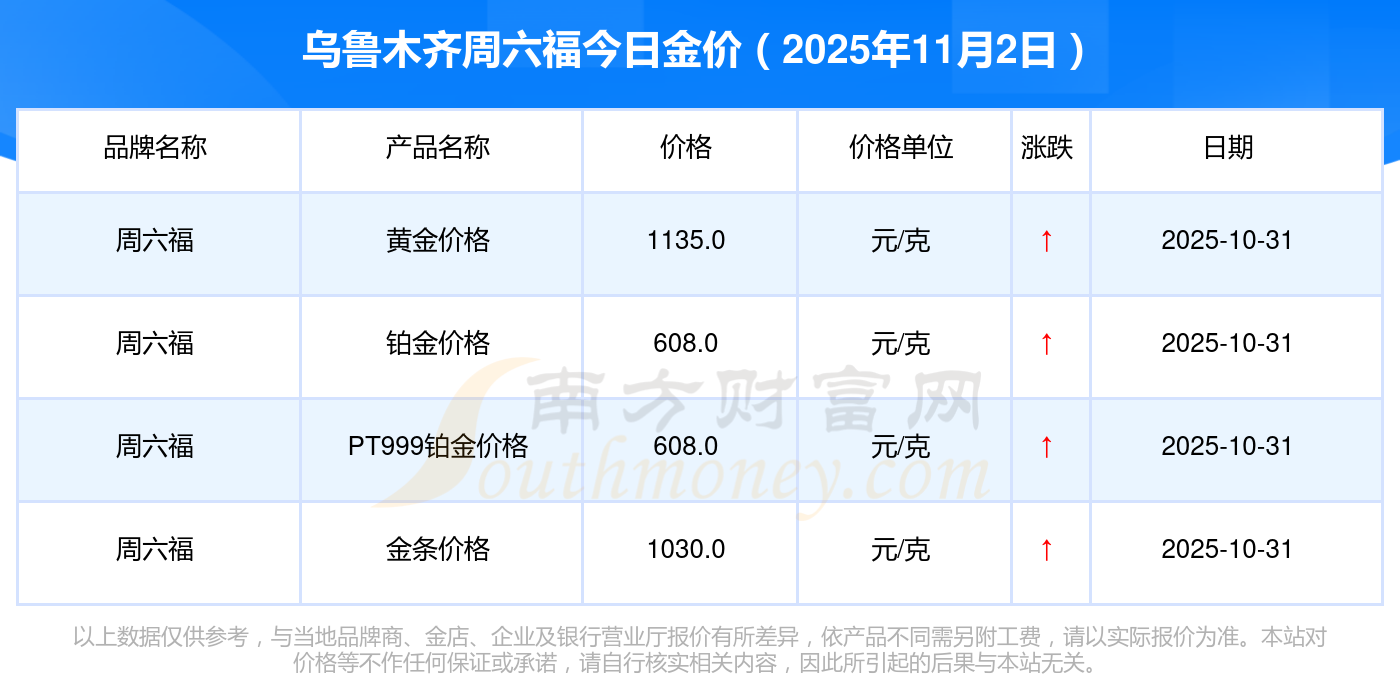 2025年11月2日烏魯木齊周六福一克黃金對(duì)應(yīng)的價(jià)格是多少?黃金價(jià)格1198.0元/克,鉑金價(jià)格650.0元/克,飾品金價(jià)(內(nèi)地)1198.0元/克,黃金飾品(香港)44660.0,鉑金價(jià)格(香港)18640.0,金條價(jià)格(香港)40080.0,金條金價(jià)(內(nèi)地)1058.0元/克,黃金價(jià)格1200.0元/克,鉑金價(jià)格560.0元/克,足金價(jià)格1200.0元/克,黃金價(jià)格1135.0元/克。