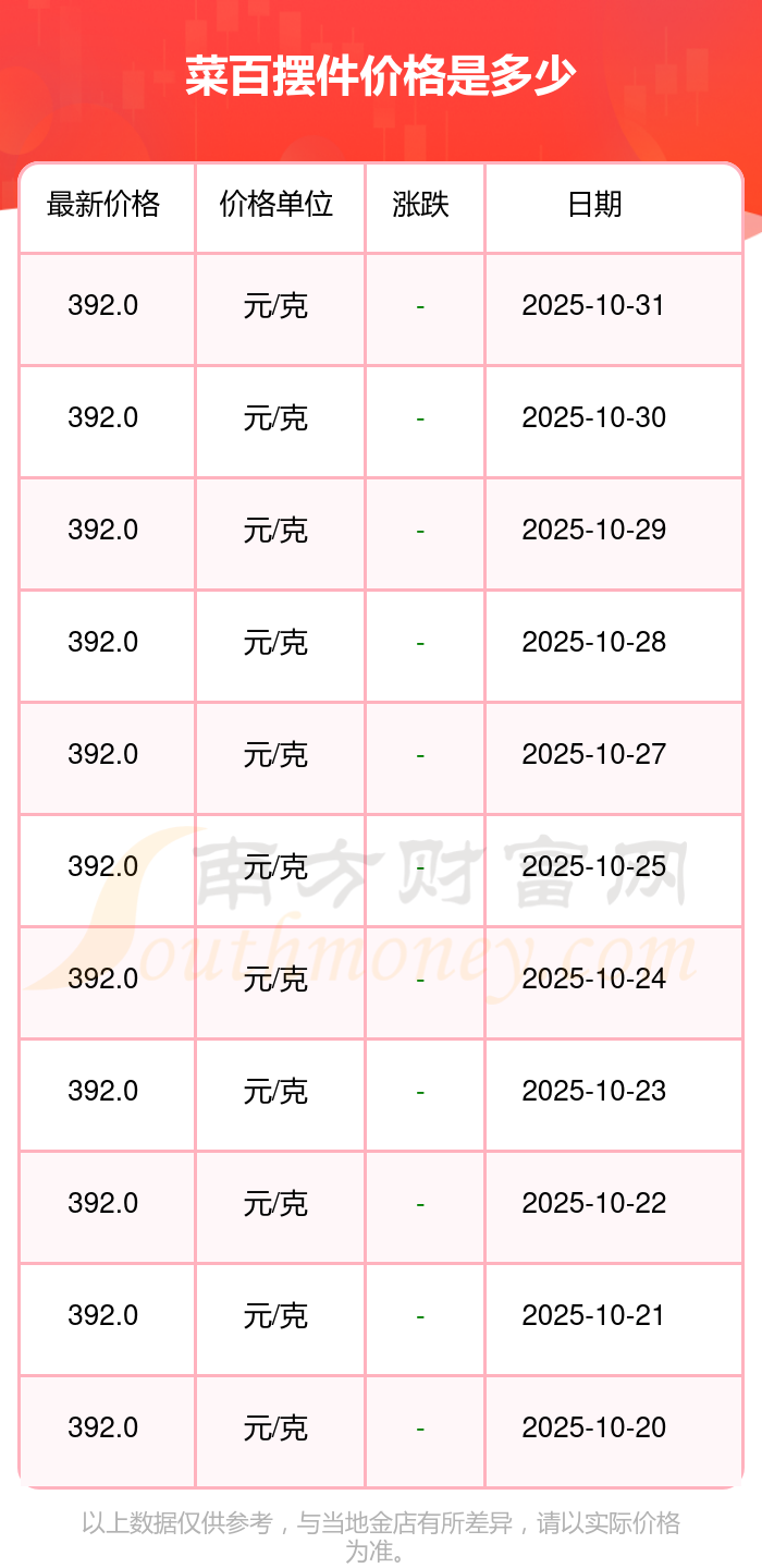 392.0元/克的價(jià)格,是菜百今日 擺件價(jià)格的最新行情。