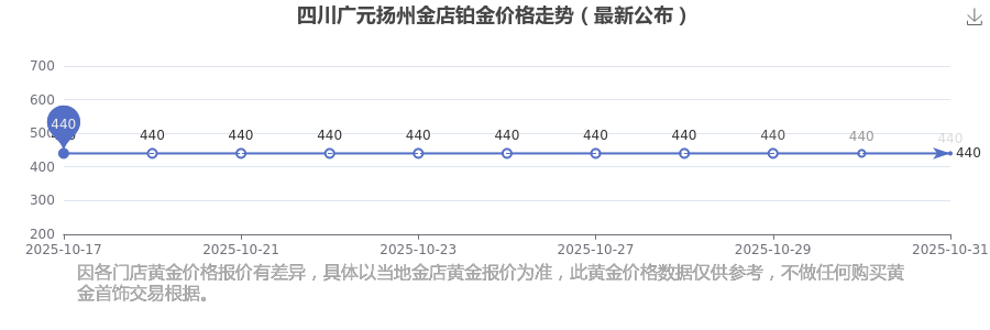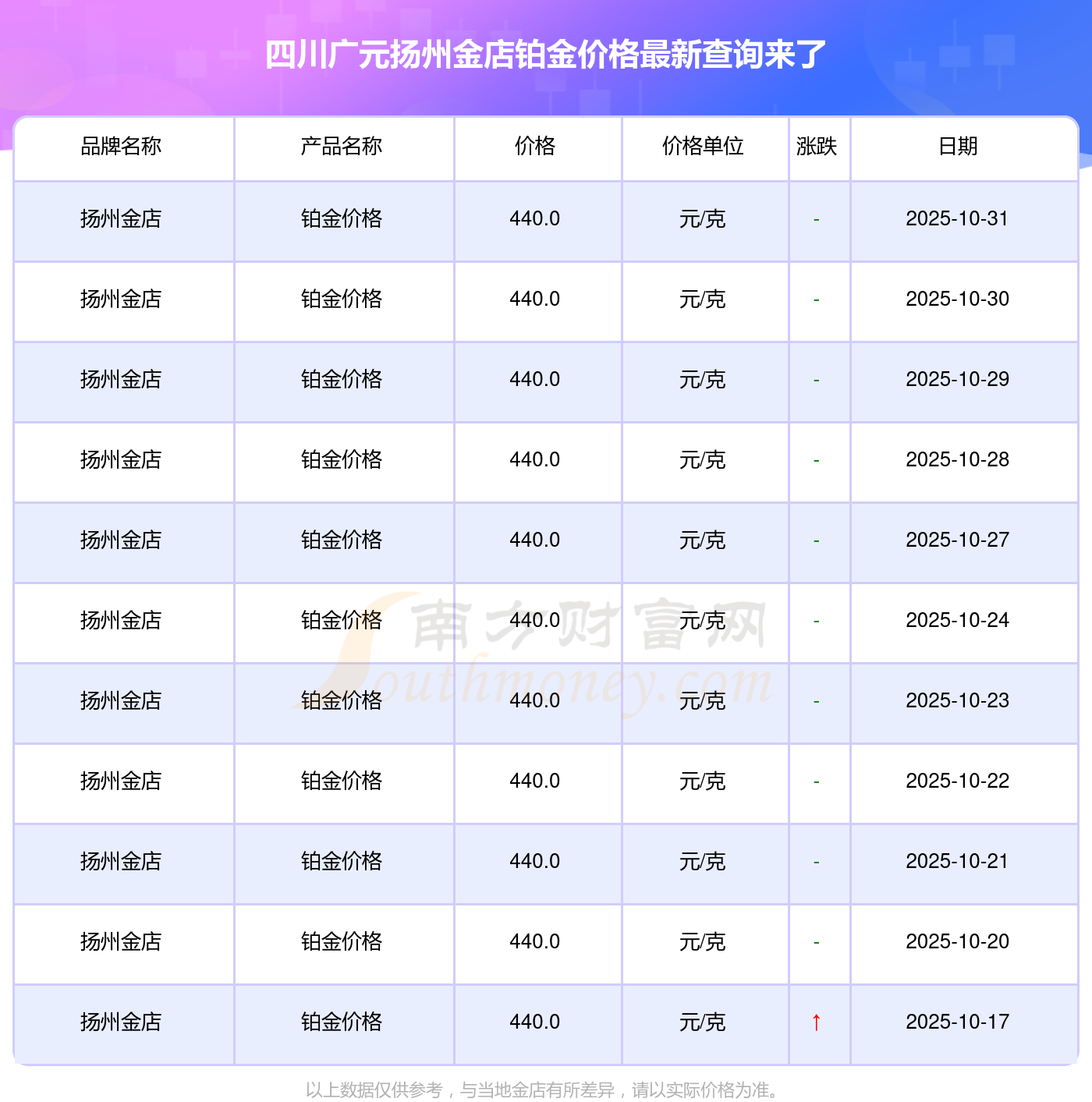 今日四川廣元揚(yáng)州金店鉑金價格最新價格是440.0元/克。