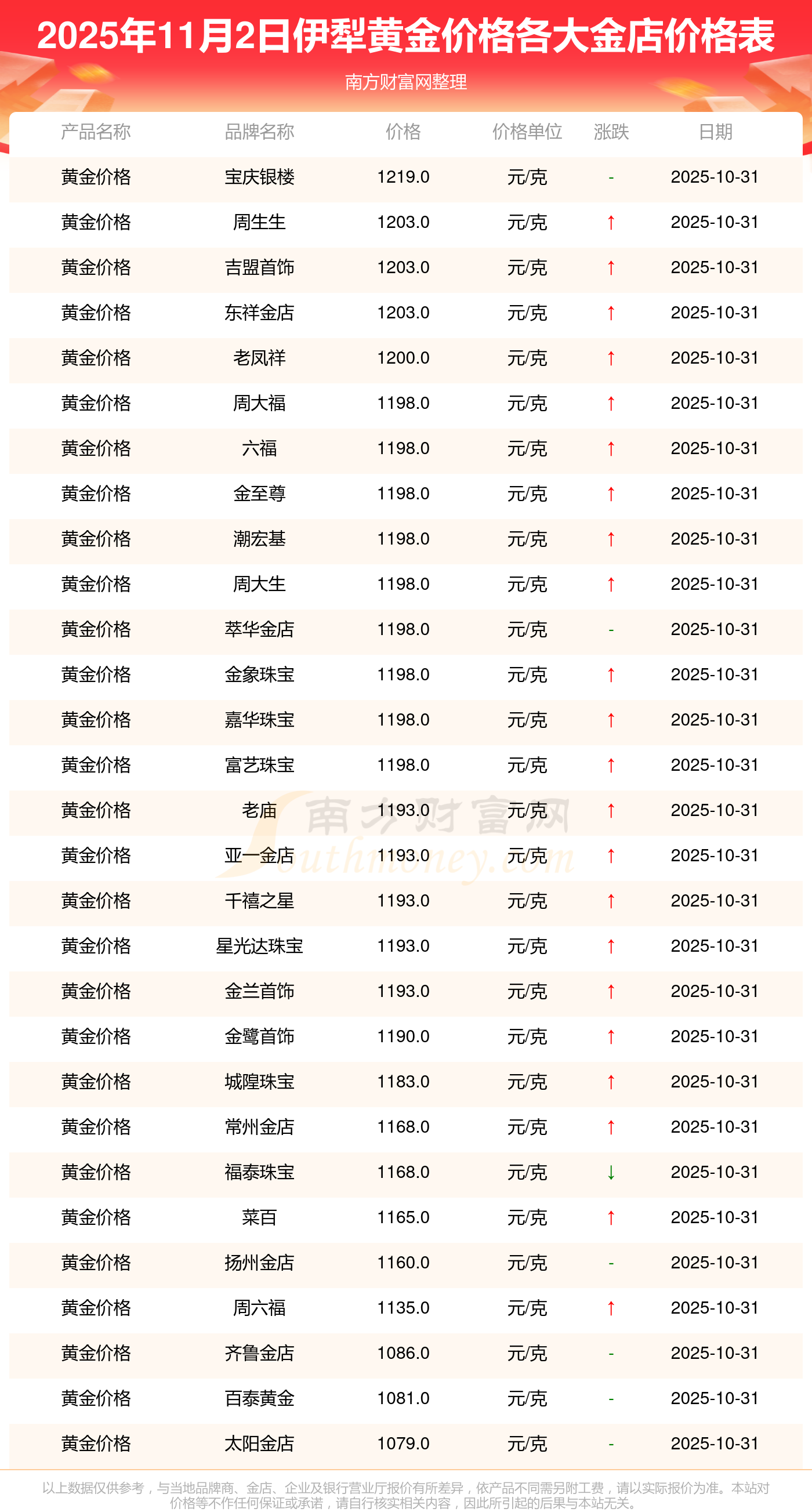 2025年11月2日伊犁周大福、周大福、周大福、周大福、周大福、周大福、周大福、老鳳祥、老鳳祥、老鳳祥、周六福等各大金店品牌黃金價(jià)格最新價(jià)格行情來了,如下:周大福黃金價(jià)格1198.0元/克,周大福鉑金價(jià)格650.0元/克,周大福飾品金價(jià)(內(nèi)地)1198.0元/克,周大福黃金飾品(香港)44660.0,周大福鉑金價(jià)格(香港)18640.0,周大福金條價(jià)格(香港)40080.0,周大福金條金價(jià)(內(nèi)地)1058.0元/克,老鳳祥黃金價(jià)格1200.0元/克,老鳳祥鉑金價(jià)格560.0元/克,老鳳祥足金價(jià)格1200.0元/克,周六福黃金價(jià)格1135.0元/克。