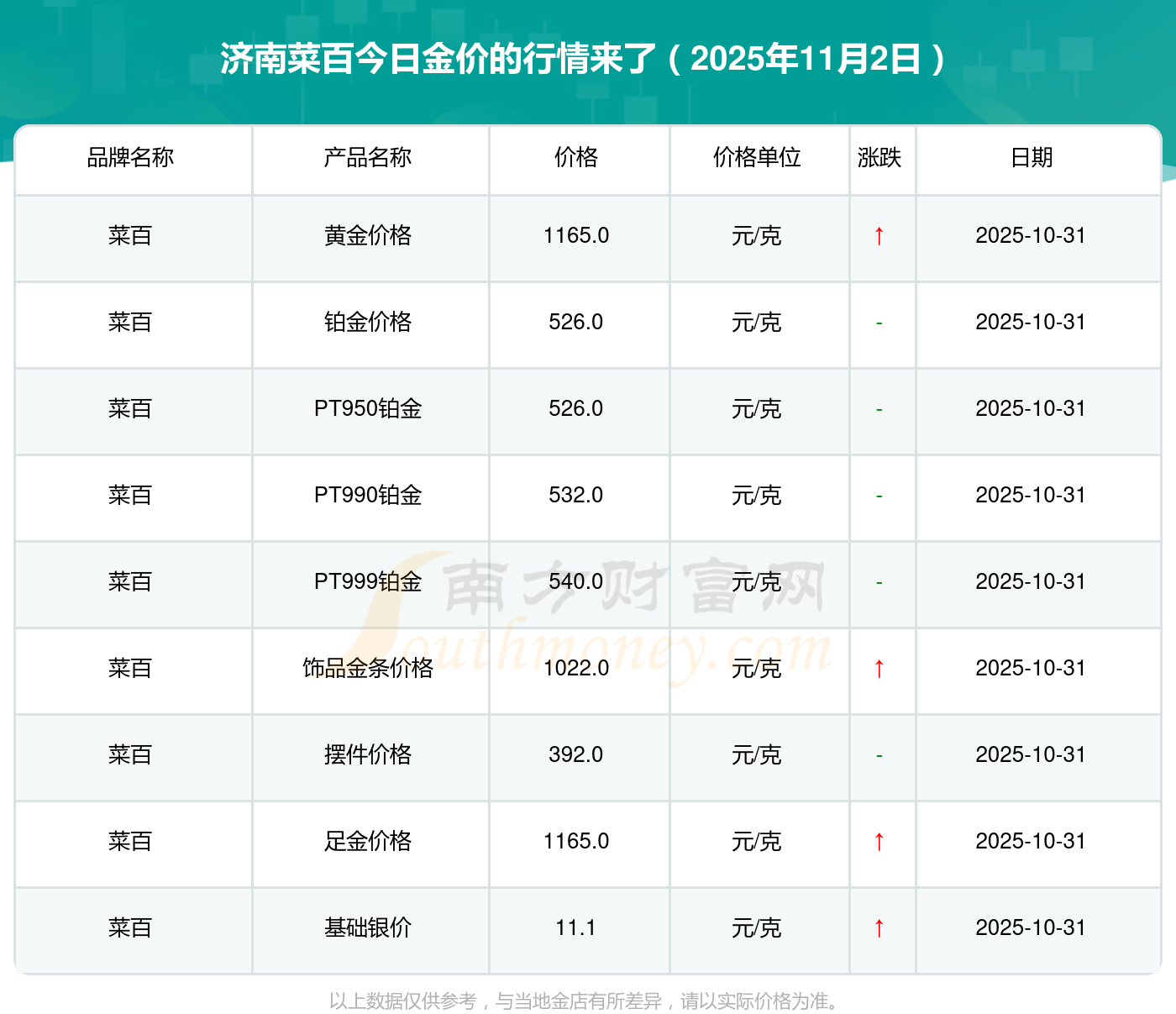 以上數(shù)據(jù)僅供參考,與當?shù)仄放粕、金店、企業(yè)及銀行營業(yè)廳報價有所差異,依產(chǎn)品不同需另附工費,請以實際報價為準。本站對價格等不作任何保證或承諾,請自行核實相關內(nèi)容,因此所引起的后果與本站無關。