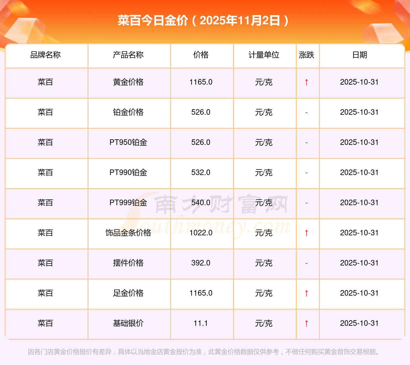 2025年11月2日菜百金價查詢:黃金價格1198.0元/克,鉑金價格650.0元/克,飾品金價(內(nèi)地)1198.0元/克,黃金飾品(香港)44660.0,鉑金價格(香港)18640.0,金條價格(香港)40080.0,金條金價(內(nèi)地)1058.0元/克,黃金價格1200.0元/克,鉑金價格560.0元/克,足金價格1200.0元/克,黃金價格1135.0元/克。