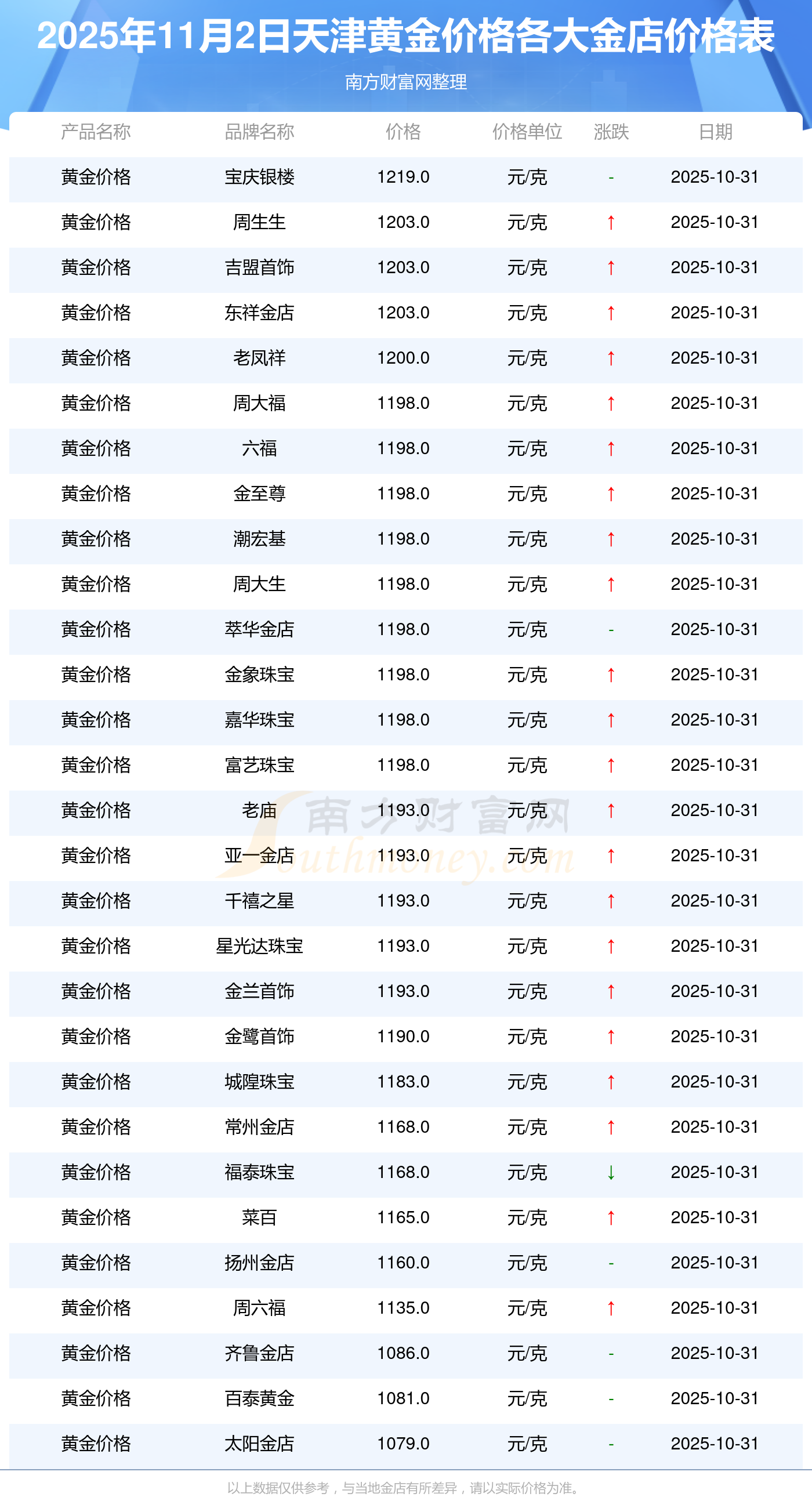 今天是2025年11月2日,天津周大福、周大福、周大福、周大福、周大福、周大福、周大福、老鳳祥、老鳳祥、老鳳祥、周六福等各大金店品牌黃金價(jià)格最新價(jià)格行情是這樣的:周大福1198.0元/克、周大福650.0元/克、周大福1198.0元/克、周大福44660.0、周大福18640.0、周大福40080.0、周大福1058.0元/克、老鳳祥1200.0元/克、老鳳祥560.0元/克、老鳳祥1200.0元/克、周六福1135.0元/克。