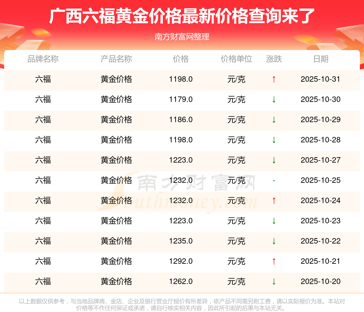 2025年11月2日,今日廣西六福黃金價格:1198.0元/克。
