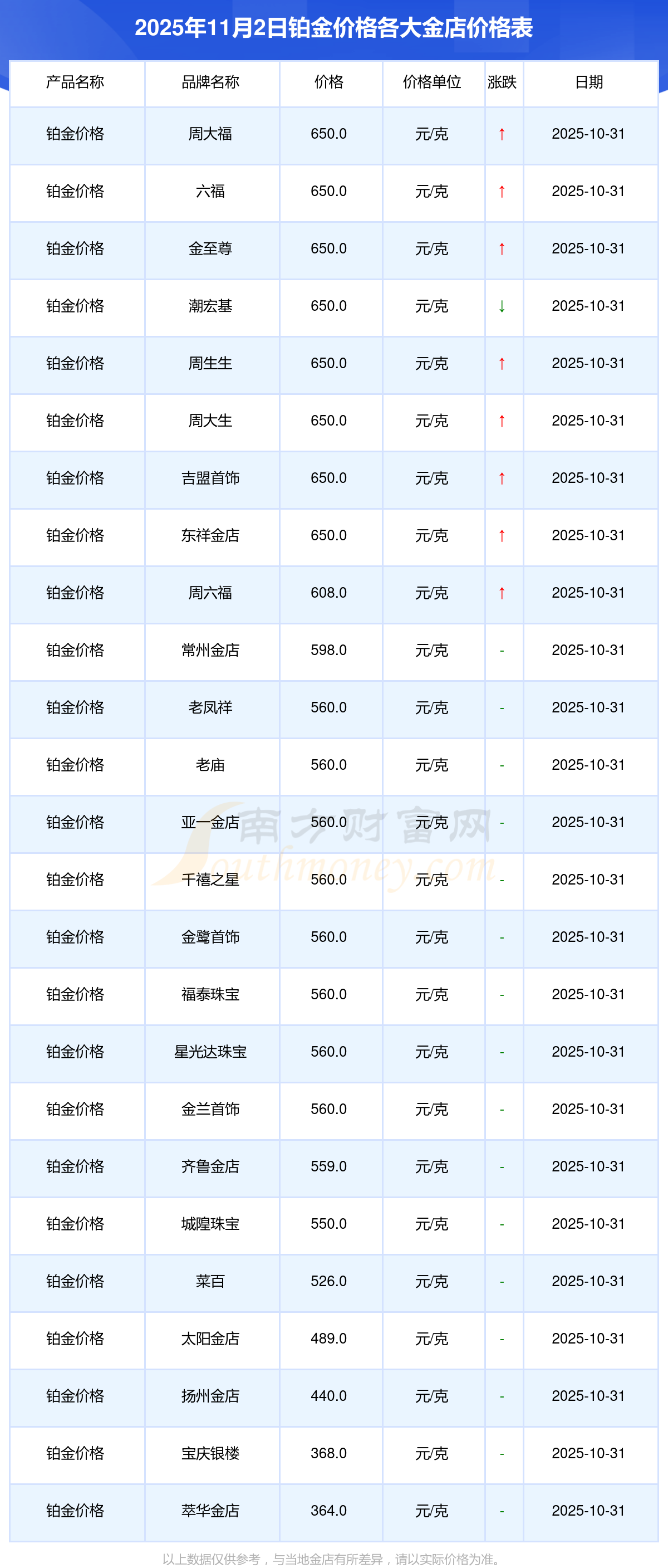 今天是2025年11月2日,周大福、周大福、周大福、周大福、周大福、周大福、周大福、老鳳祥、老鳳祥、老鳳祥、周六福等各大金店品牌鉑金價(jià)格最新價(jià)格如下:周大福1198.0元/克、周大福650.0元/克、周大福1198.0元/克、周大福44660.0、周大福18640.0、周大福40080.0、周大福1058.0元/克、老鳳祥1200.0元/克、老鳳祥560.0元/克、老鳳祥1200.0元/克、周六福1135.0元/克。