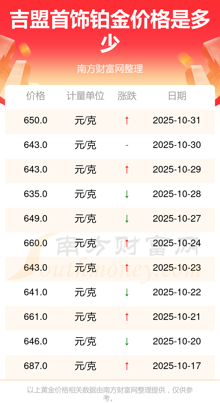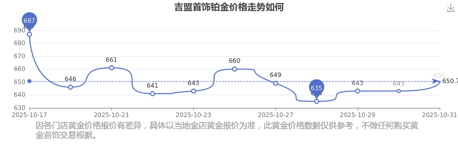 2025年11月2日吉盟首飾鉑金價格為650.0元/克。