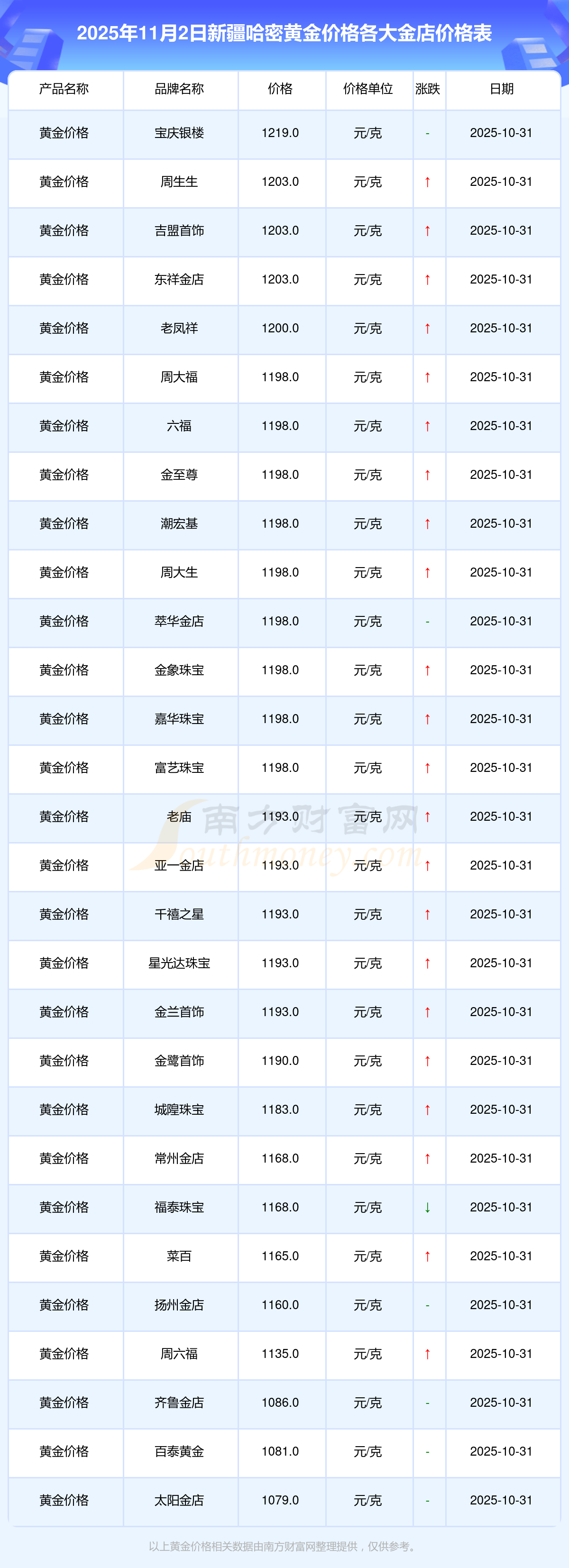 今天是2025年11月2日,新疆哈密周大福、周大福、周大福、周大福、周大福、周大福、周大福、老鳳祥、老鳳祥、老鳳祥、周六福等各大金店品牌黃金價(jià)格最新價(jià)格行情是這樣的:周大福1198.0元/克、周大福650.0元/克、周大福1198.0元/克、周大福44660.0、周大福18640.0、周大福40080.0、周大福1058.0元/克、老鳳祥1200.0元/克、老鳳祥560.0元/克、老鳳祥1200.0元/克、周六福1135.0元/克。