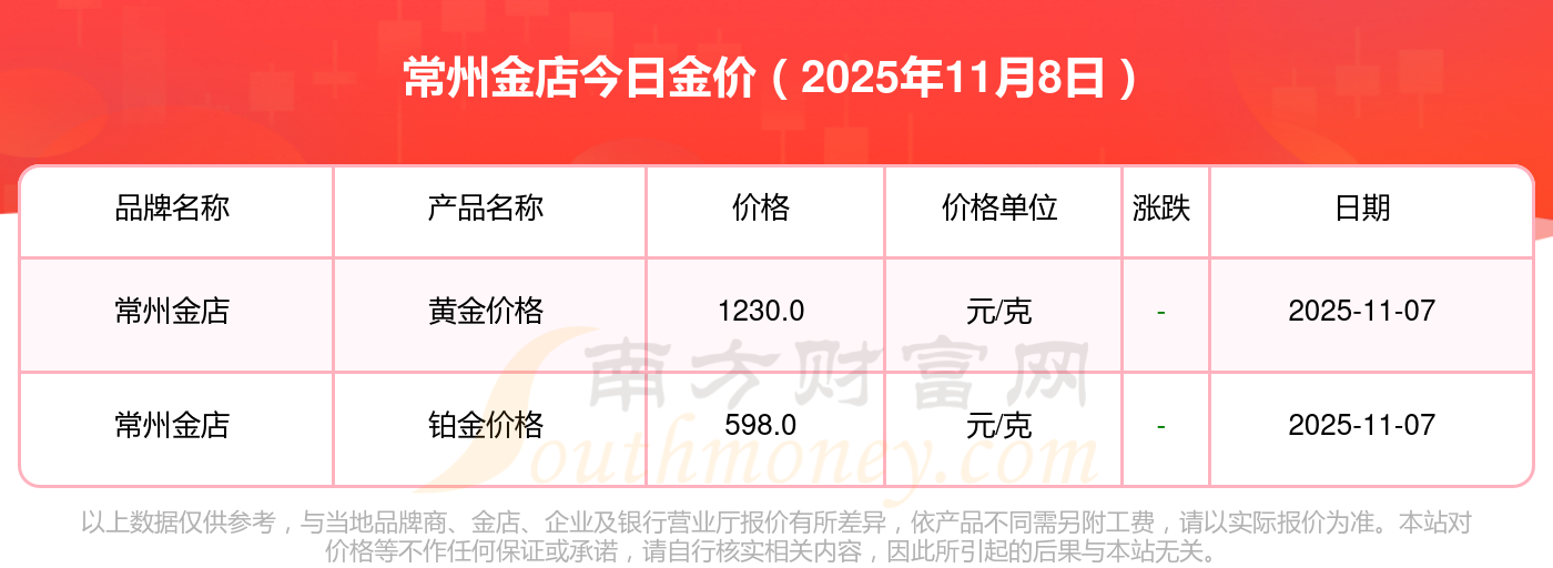 2025年11月8日寶泉錢幣、金蘭首飾、金蘭首飾、謝瑞麟、謝瑞麟、謝瑞麟、謝瑞麟、謝瑞麟、金銀街、金銀街、金銀街等各大金店品牌黃金價格最新價格如下:寶泉錢幣銀條價格11.4元/克,金蘭首飾黃金價格1263.0元/克,金蘭首飾鉑金價格560.0元/克,謝瑞麟金條價格(內地)1202.0元/克,謝瑞麟金飾價格(內地)1268.0元/克,謝瑞麟黃金飾品(香港)44260.0,謝瑞麟鉑金飾品(香港)13080.0,謝瑞麟金條金價(香港)39960.0,金銀街投資金條1243.0元/克,金銀街工藝金條1258.0元/克,金銀街千足金首飾1248.0元/克。
