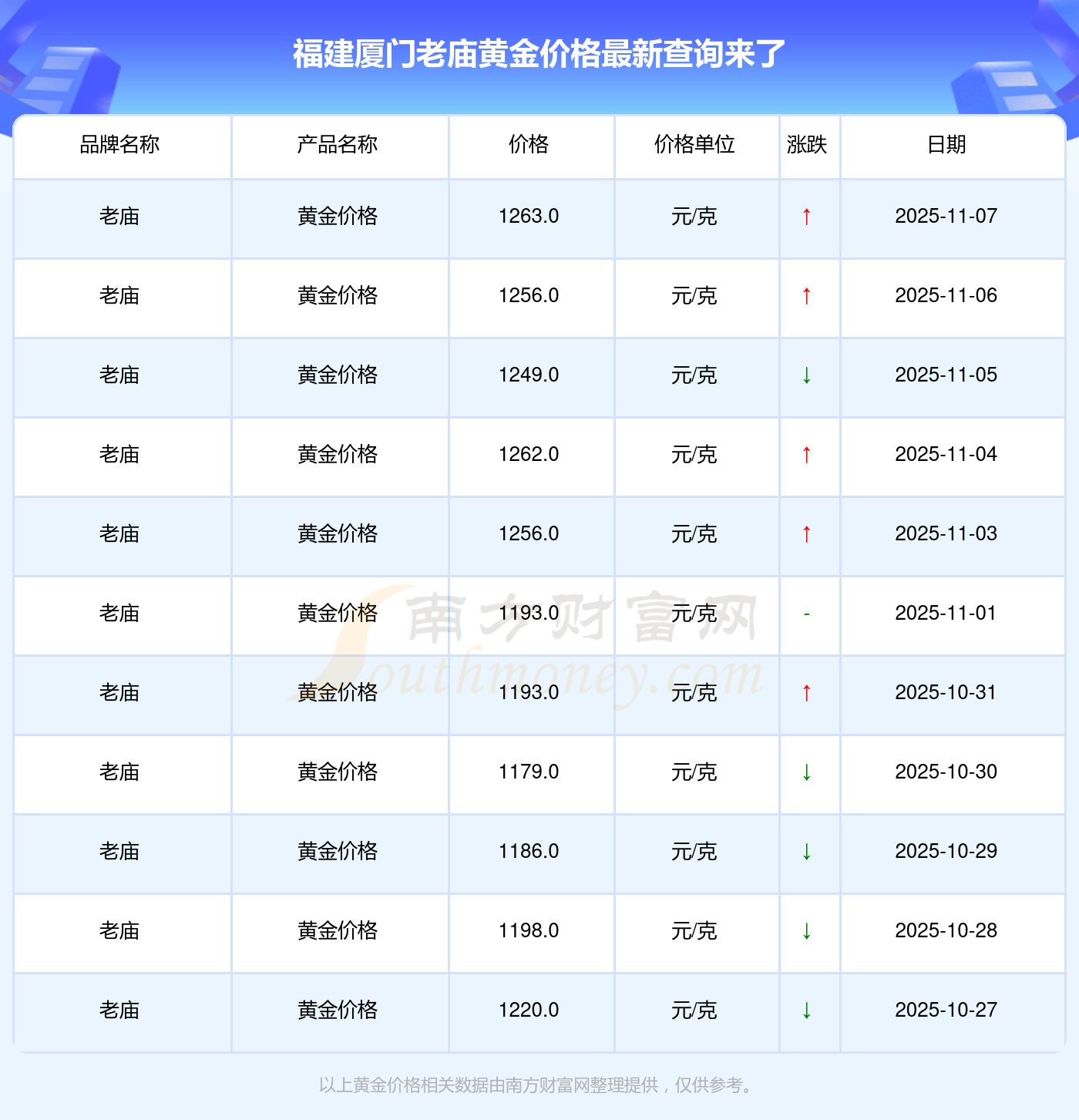 2025年11月8日,福建廈門(mén)老廟黃金價(jià)格每克的售賣(mài)價(jià)位為1263.0元/克。