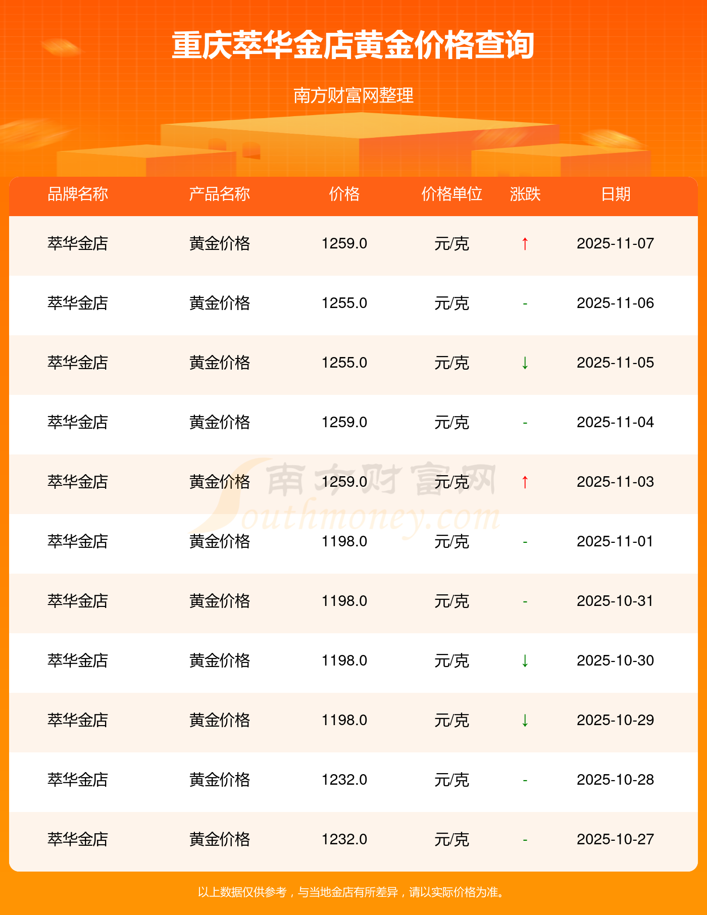 2025年11月8日重慶萃華金店黃金價格為1259.0元/克。