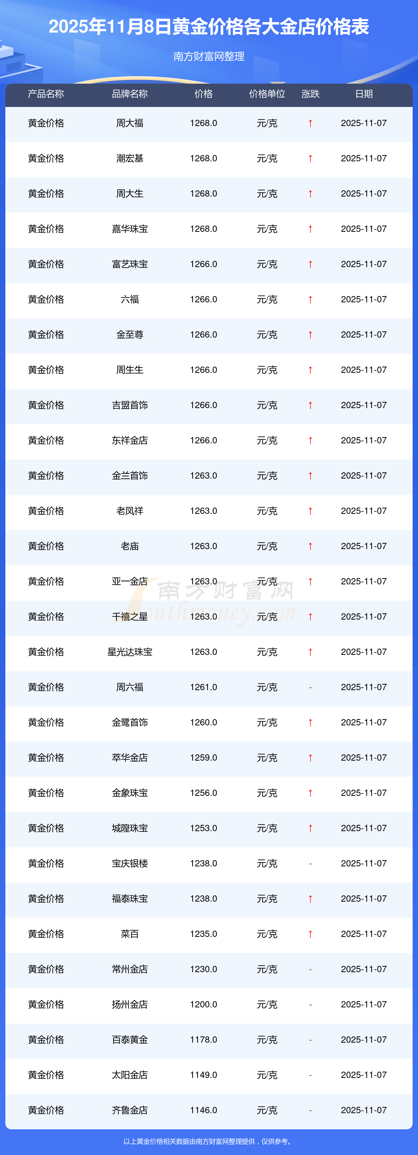 今天是2025年11月8日,寶泉錢幣、金蘭首飾、金蘭首飾、謝瑞麟、謝瑞麟、謝瑞麟、謝瑞麟、謝瑞麟、金銀街、金銀街、金銀街等各大金店品牌黃金價格最新價格如下:寶泉錢幣11.4元/克、金蘭首飾1263.0元/克、金蘭首飾560.0元/克、謝瑞麟1202.0元/克、謝瑞麟1268.0元/克、謝瑞麟44260.0、謝瑞麟13080.0、謝瑞麟39960.0、金銀街1243.0元/克、金銀街1258.0元/克、金銀街1248.0元/克。
