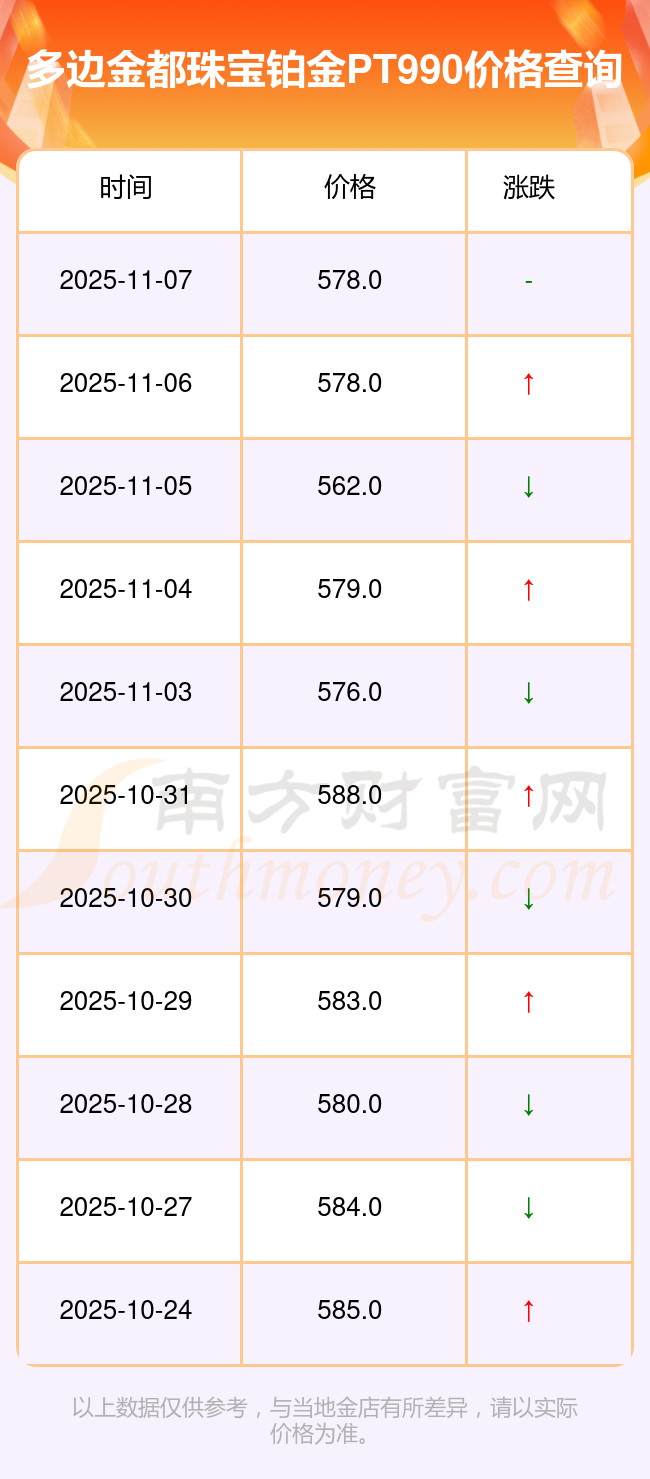 今日(2025年11月8日),多邊金都珠寶鉑金PT990最新價(jià)格為578.0元/克。