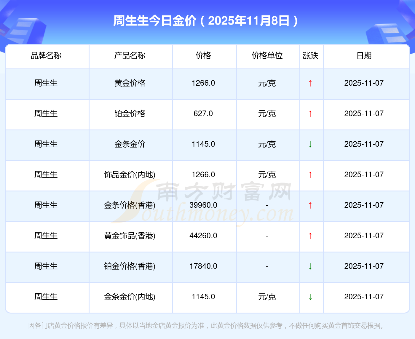 你了解周生生金價今日價格嗎?以下是詳情數據:銀條價格11.4元/克,黃金價格1263.0元/克,鉑金價格560.0元/克,金條價格(內地)1202.0元/克,金飾價格(內地)1268.0元/克,黃金飾品(香港)44260.0,鉑金飾品(香港)13080.0,金條金價(香港)39960.0,投資金條1243.0元/克,工藝金條1258.0元/克,千足金首飾1248.0元/克。