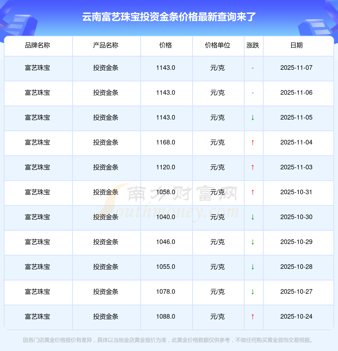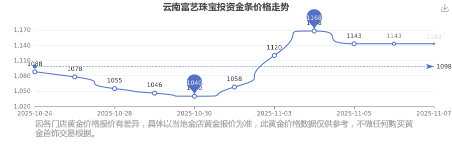 今日(2025年11月8日),1143.0元/克是云南富藝珠寶投資金條的價(jià)格標(biāo)準(zhǔn)。