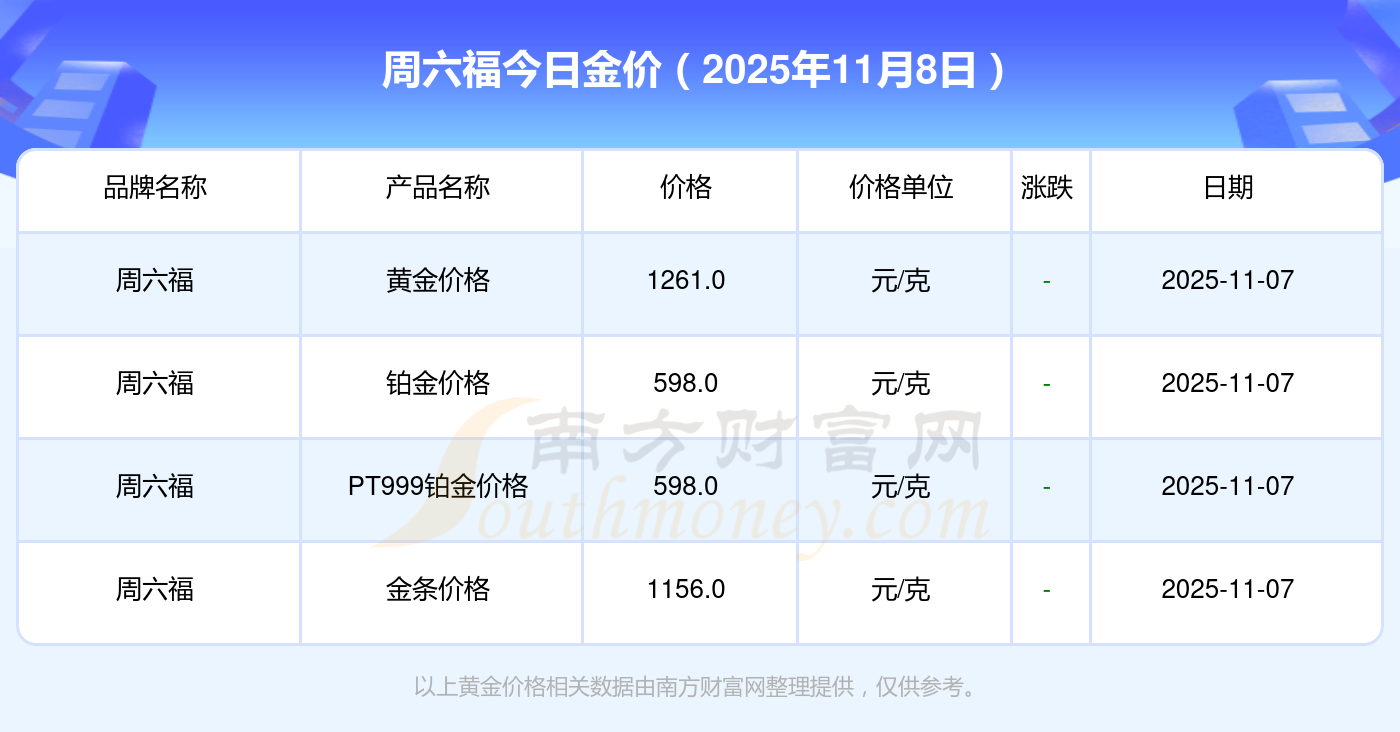 銀條價(jià)格11.4元/克,黃金價(jià)格1263.0元/克,鉑金價(jià)格560.0元/克,金條價(jià)格(內(nèi)地)1202.0元/克,金飾價(jià)格(內(nèi)地)1268.0元/克,黃金飾品(香港)44260.0,鉑金飾品(香港)13080.0,金條金價(jià)(香港)39960.0,投資金條1243.0元/克,工藝金條1258.0元/克,千足金首飾1248.0元/克。