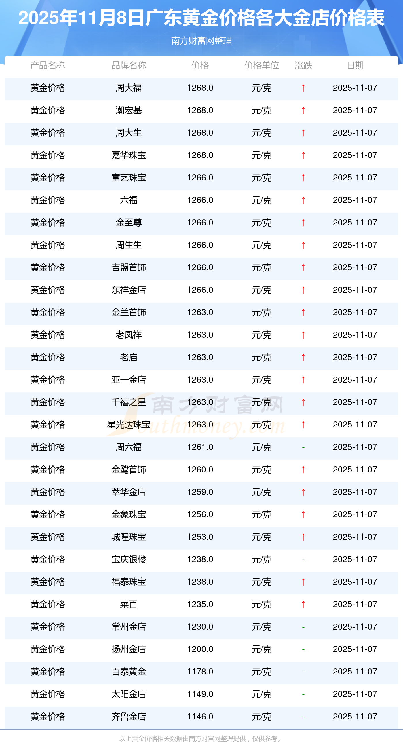 2025年11月8日,廣東寶泉錢幣、金蘭首飾、金蘭首飾、謝瑞麟、謝瑞麟、謝瑞麟、謝瑞麟、謝瑞麟、金銀街、金銀街、金銀街等各大金店品牌黃金價(jià)格今日價(jià)格行情最新來(lái)了:寶泉錢幣11.4元/克、金蘭首飾1263.0元/克、金蘭首飾560.0元/克、謝瑞麟1202.0元/克、謝瑞麟1268.0元/克、謝瑞麟44260.0、謝瑞麟13080.0、謝瑞麟39960.0、金銀街1243.0元/克、金銀街1258.0元/克、金銀街1248.0元/克。