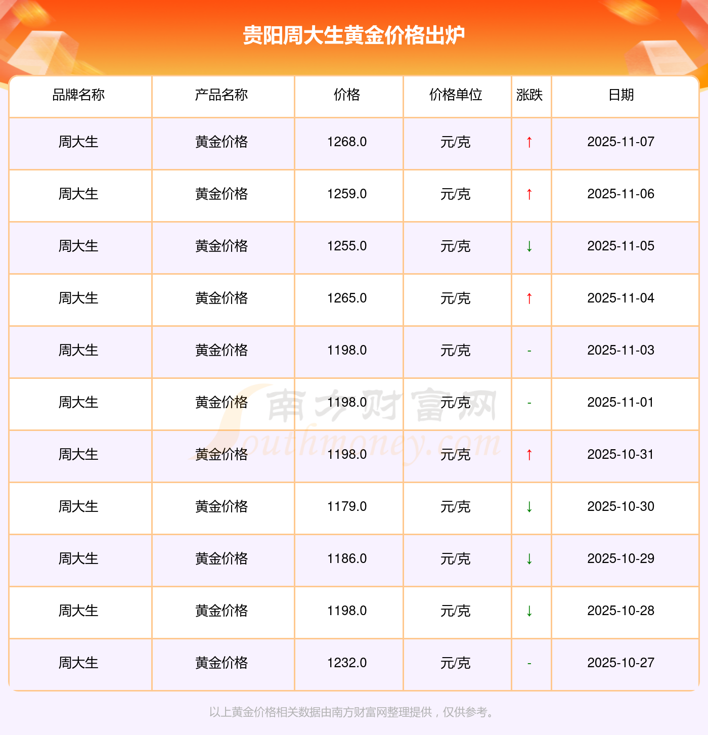 今日(2025年11月8日),貴陽(yáng)周大生黃金價(jià)格:1268.0元/克。