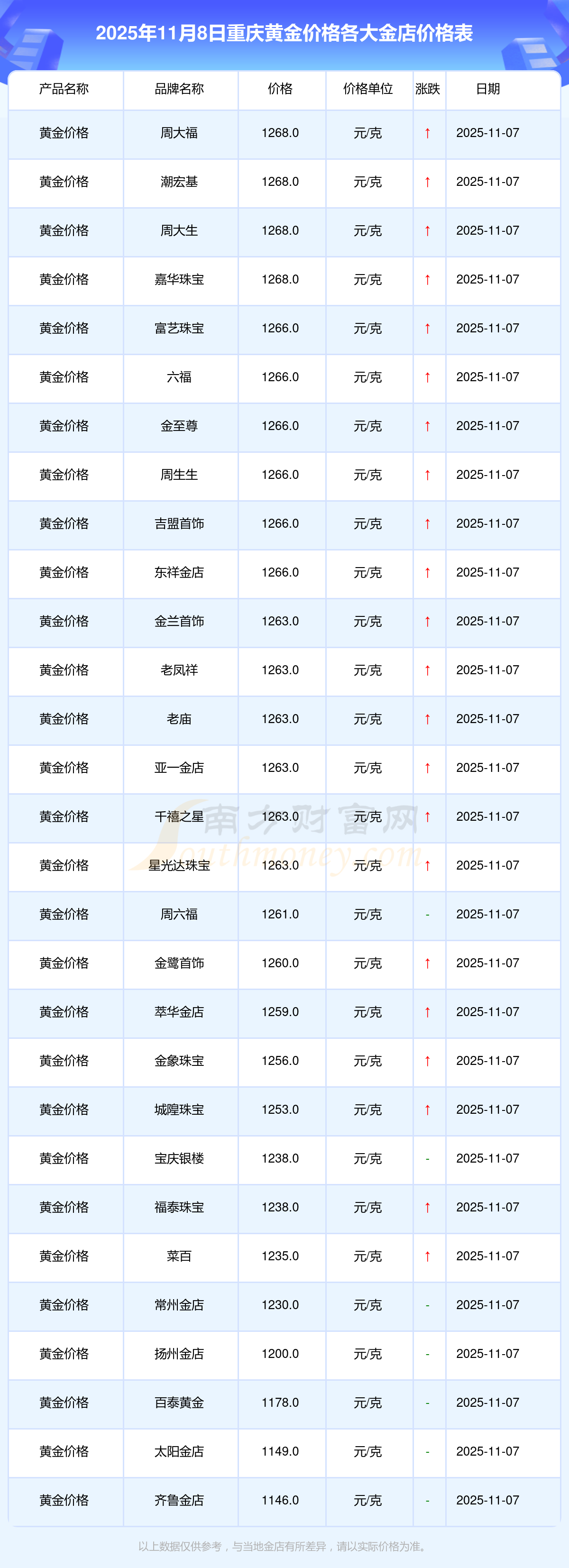 今天是2025年11月8日,重慶寶泉錢幣、金蘭首飾、金蘭首飾、謝瑞麟、謝瑞麟、謝瑞麟、謝瑞麟、謝瑞麟、金銀街、金銀街、金銀街等各大金店品牌黃金價格最新價格行情是這樣的:寶泉錢幣11.4元/克、金蘭首飾1263.0元/克、金蘭首飾560.0元/克、謝瑞麟1202.0元/克、謝瑞麟1268.0元/克、謝瑞麟44260.0、謝瑞麟13080.0、謝瑞麟39960.0、金銀街1243.0元/克、金銀街1258.0元/克、金銀街1248.0元/克。