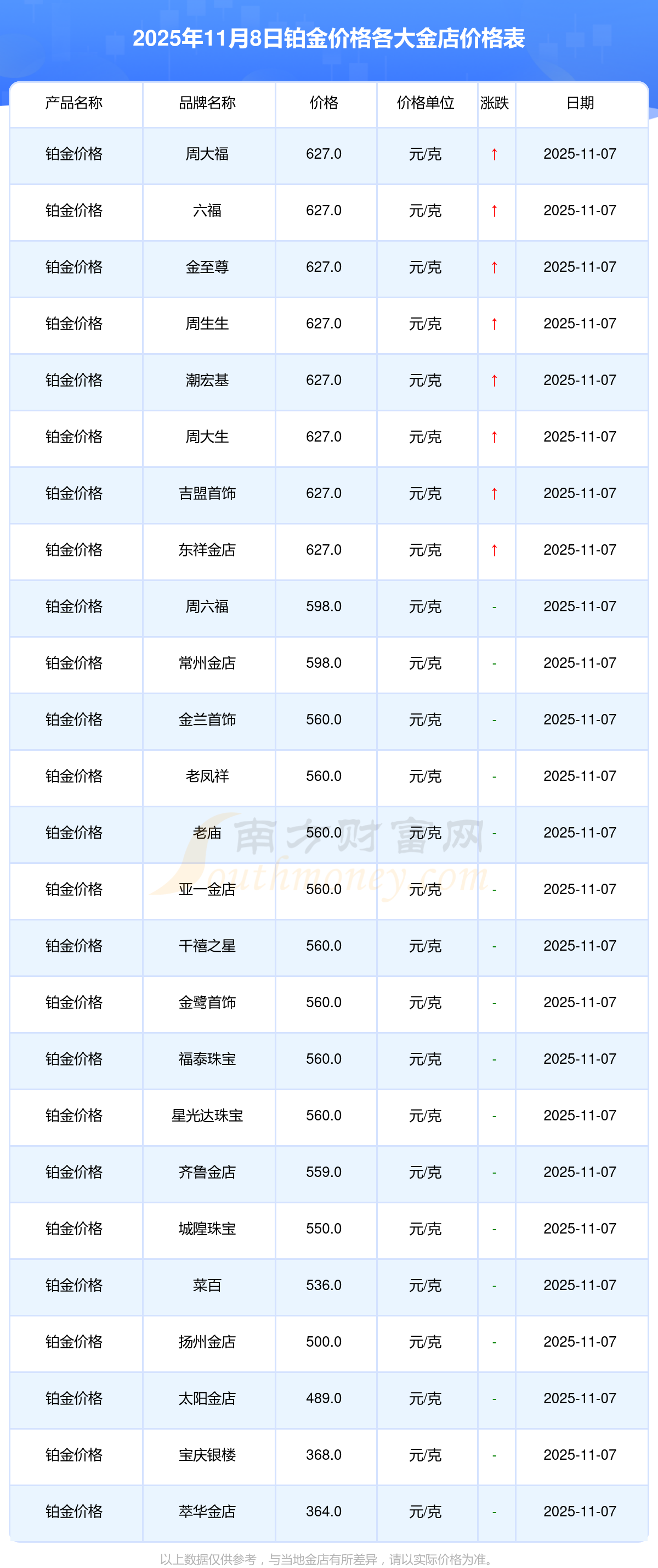 2025年11月8日寶泉錢幣、金蘭首飾、金蘭首飾、謝瑞麟、謝瑞麟、謝瑞麟、謝瑞麟、謝瑞麟、金銀街、金銀街、金銀街等各大金店品牌鉑金價(jià)格最新價(jià)格如下:寶泉錢幣銀條價(jià)格11.4元/克,金蘭首飾黃金價(jià)格1263.0元/克,金蘭首飾鉑金價(jià)格560.0元/克,謝瑞麟金條價(jià)格(內(nèi)地)1202.0元/克,謝瑞麟金飾價(jià)格(內(nèi)地)1268.0元/克,謝瑞麟黃金飾品(香港)44260.0,謝瑞麟鉑金飾品(香港)13080.0,謝瑞麟金條金價(jià)(香港)39960.0,金銀街投資金條1243.0元/克,金銀街工藝金條1258.0元/克,金銀街千足金首飾1248.0元/克。
