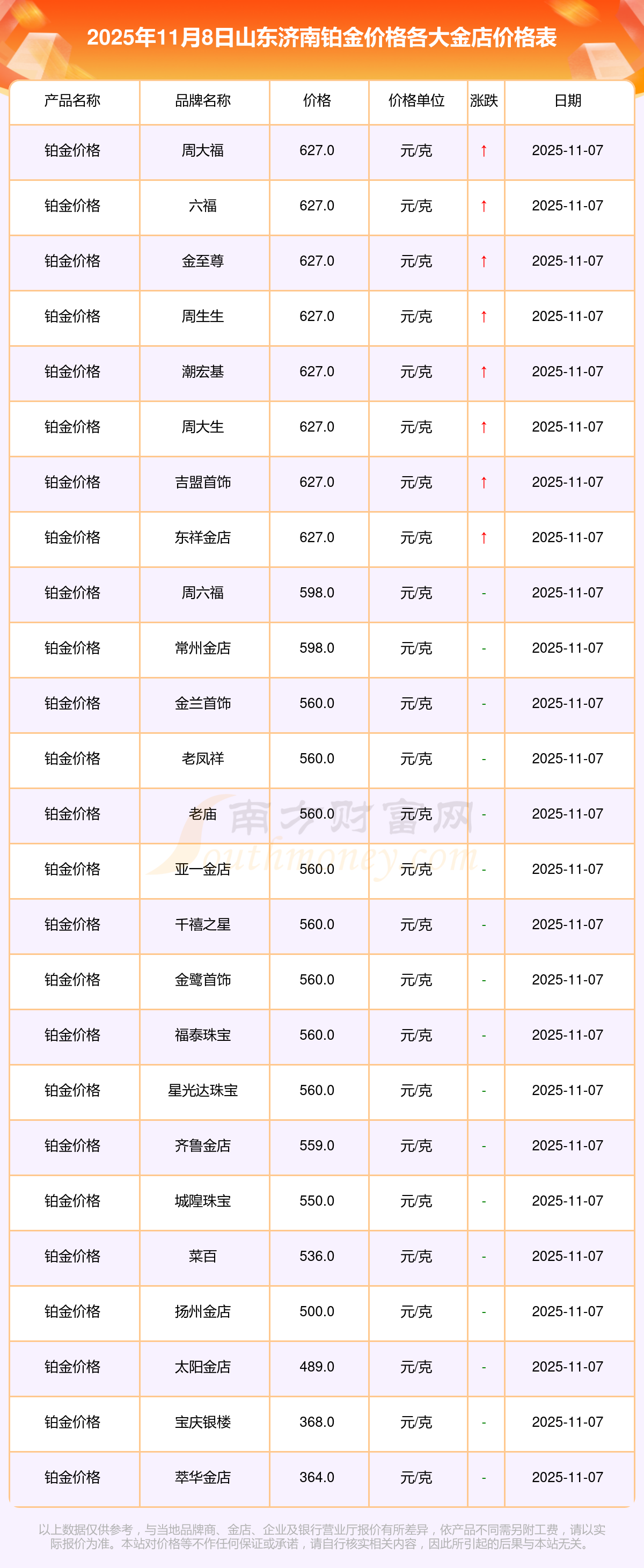 以上數(shù)據(jù)僅供參考,與當(dāng)?shù)仄放粕、金店、企業(yè)及銀行營業(yè)廳報價有所差異,依產(chǎn)品不同需另附工費,請以實際報價為準(zhǔn)。本站對價格等不作任何保證或承諾,請自行核實相關(guān)內(nèi)容,因此所引起的后果與本站無關(guān)。