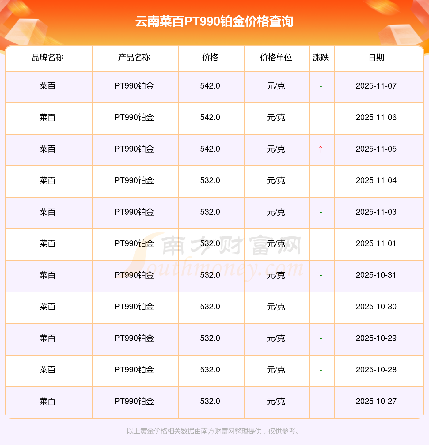 今日(2025年11月8日),542.0元/克是云南菜百PT990鉑金的價格標(biāo)準(zhǔn)。