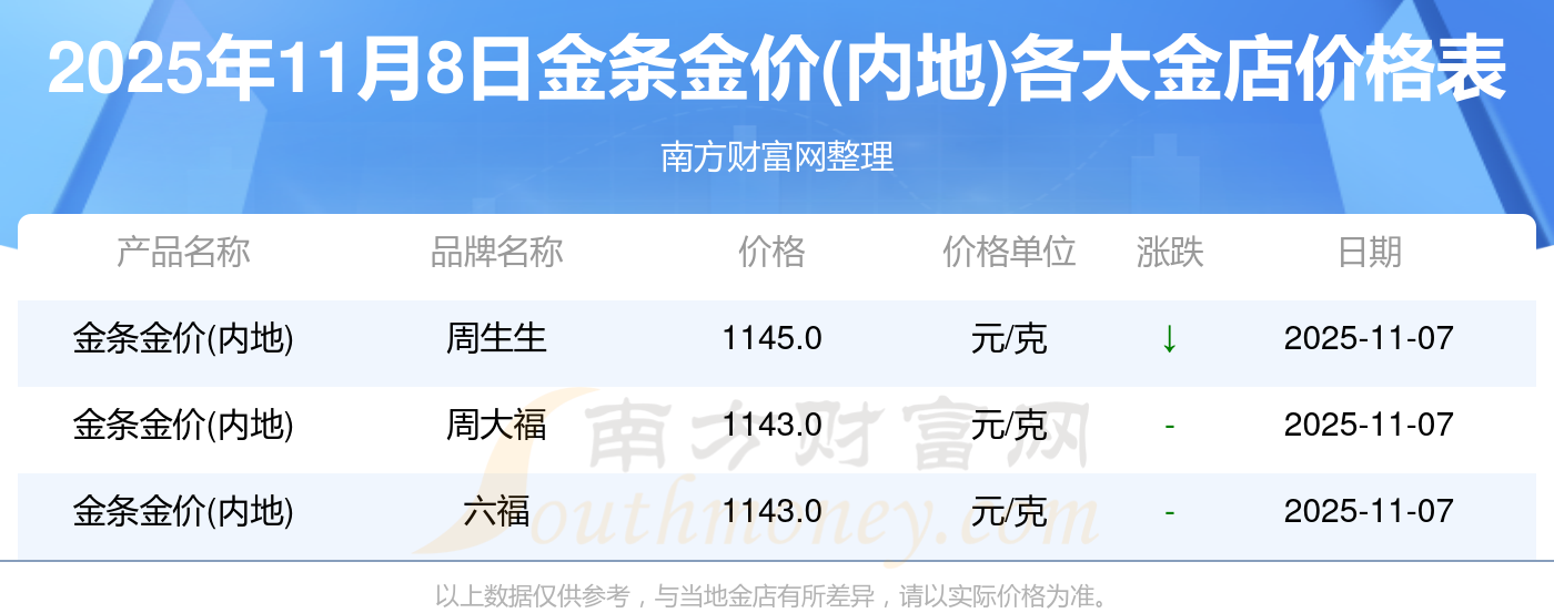 今日金條金價(內(nèi)地)查詢,2025年11月8日各金店金條金價(內(nèi)地)最新公布,隨小編來看看。