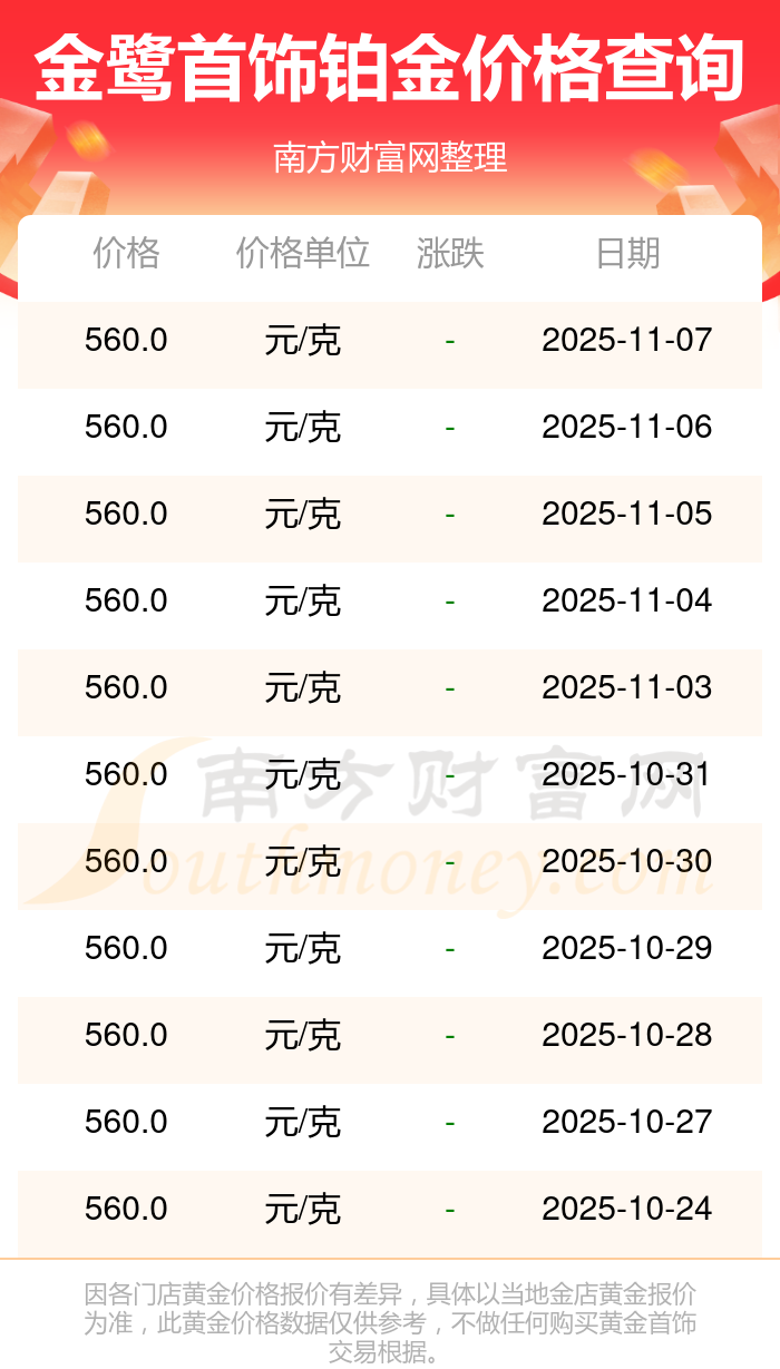 今日(2025年11月8日),金鷺首飾鉑金價(jià)格:560.0元/克。
