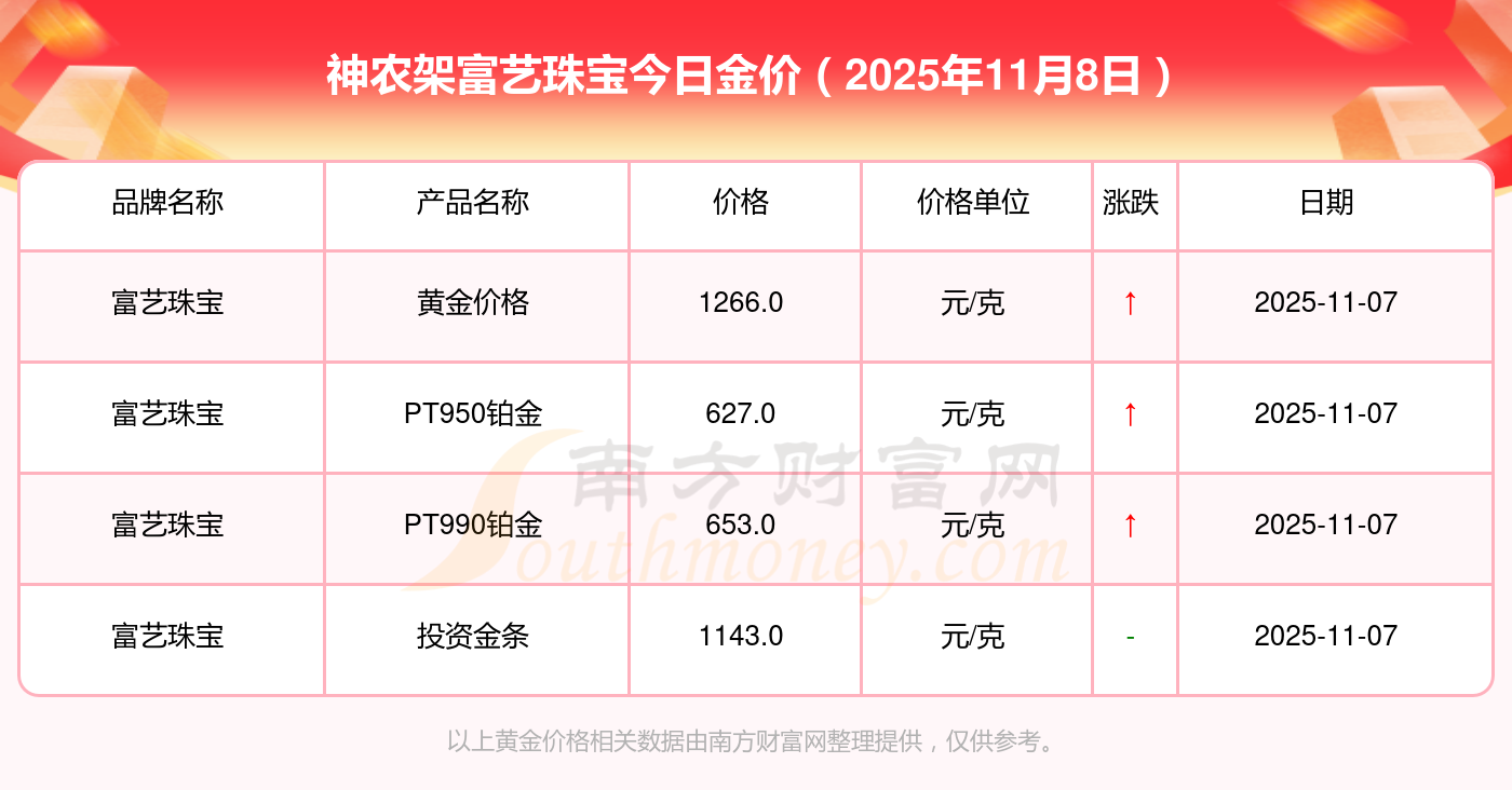 2025年11月8日富藝珠寶金條多少錢(qián)1克 現(xiàn)在神農(nóng)架富藝珠寶黃金價(jià)格查詢
