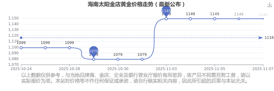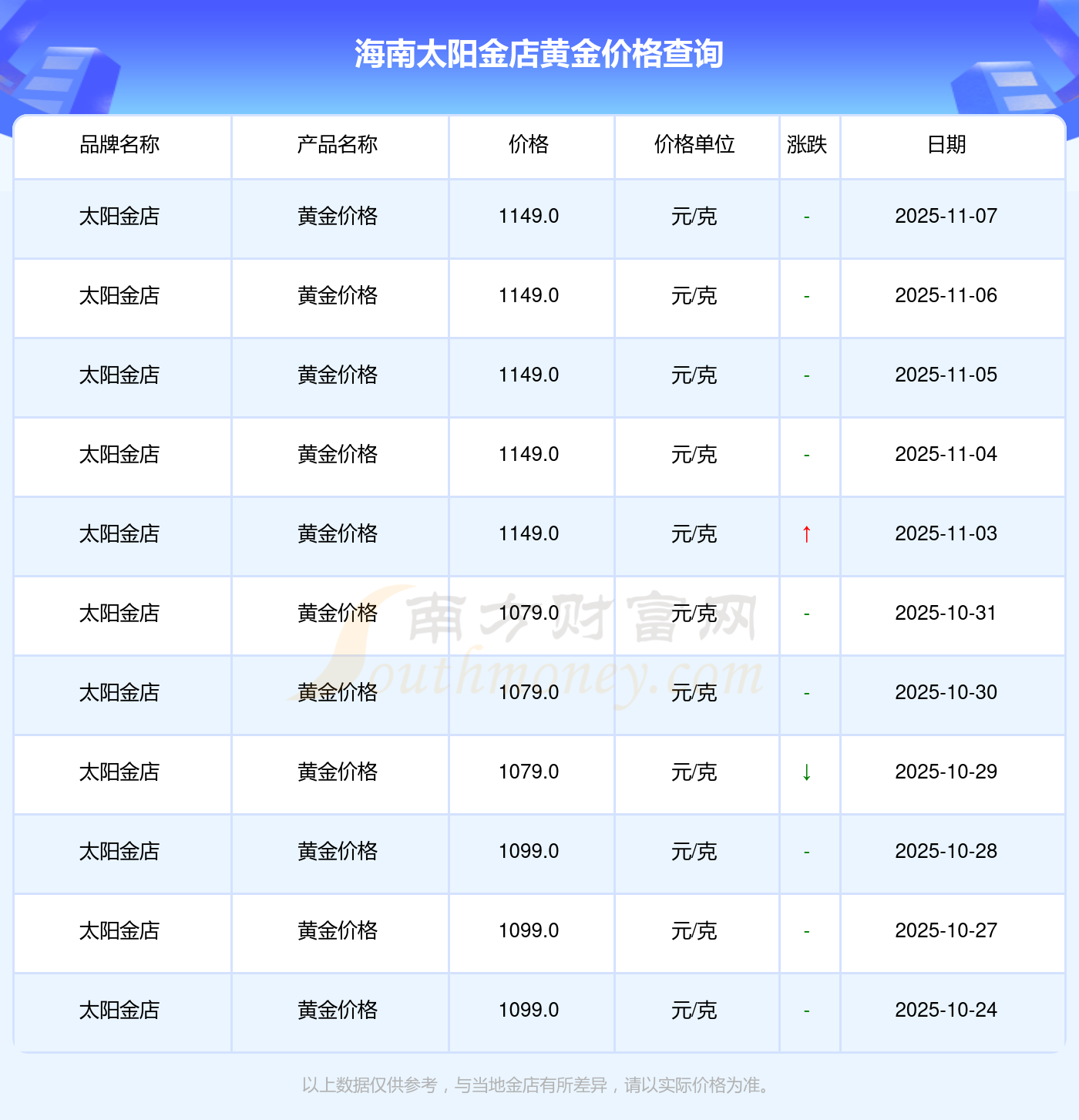 1149.0元/克,這是海南太陽金店于 2025年11月8日所定的黃金價格。