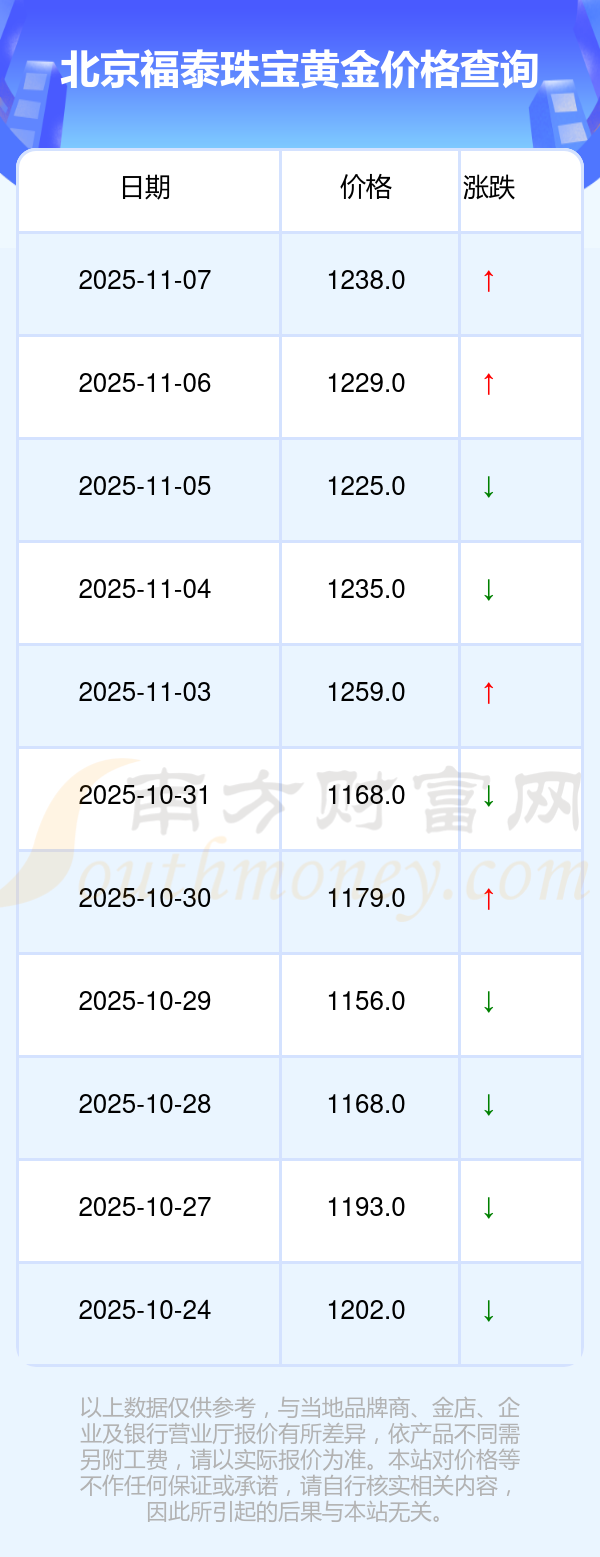今日(2025年11月8日)北京福泰珠寶黃金價格是1238.0元/克。