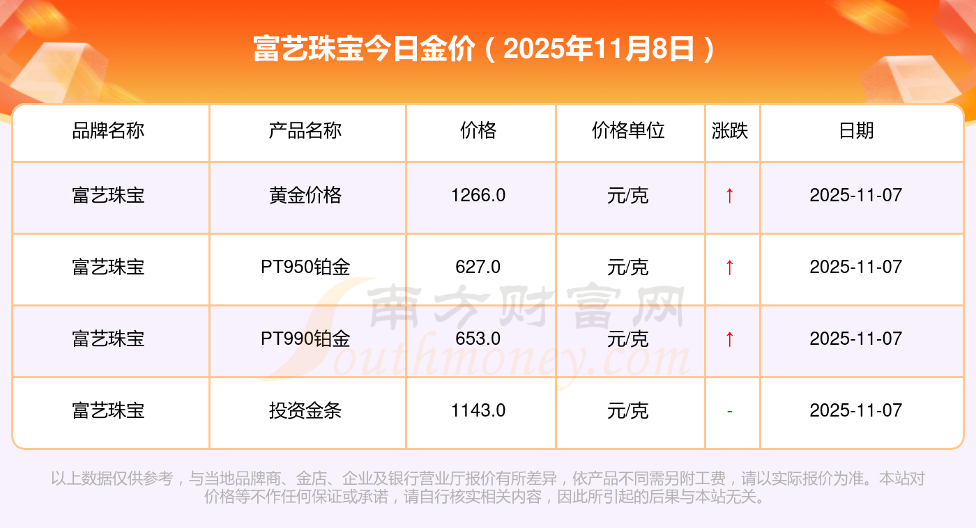 現(xiàn)在富藝珠寶黃金價格是多少錢1克_2025年富藝珠寶今日金價是多少錢一克,最新富藝珠寶查詢,2025年11月8日富藝珠寶PT950鉑金現(xiàn)在每克多少錢?最新富藝珠寶PT950鉑金報價公布,一起來看看吧!