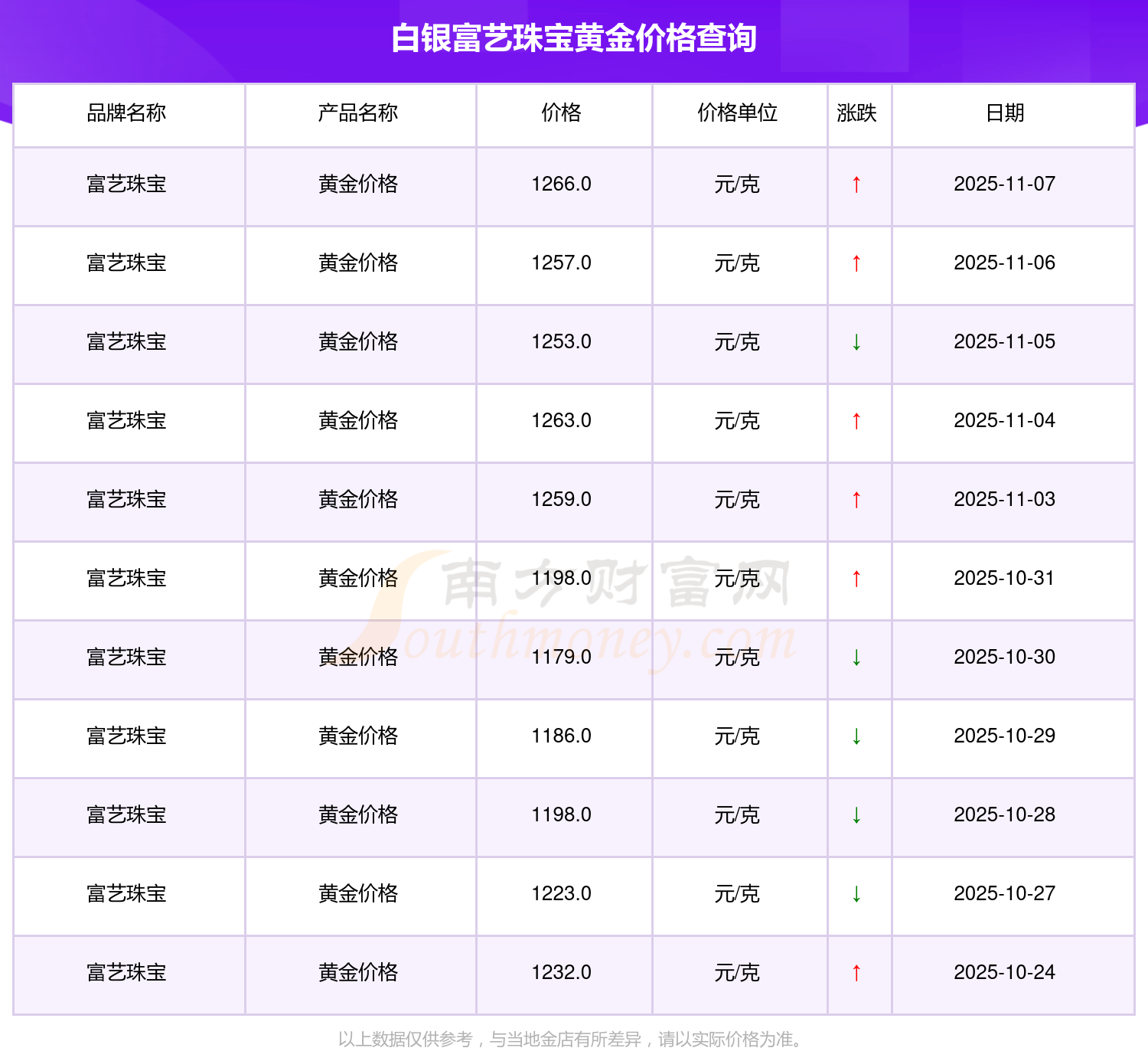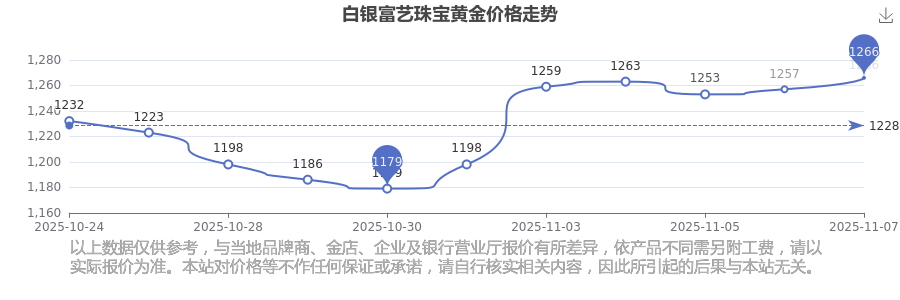 (2025年11月8日)今日白銀富藝珠寶黃金價格是1266.0元/克。