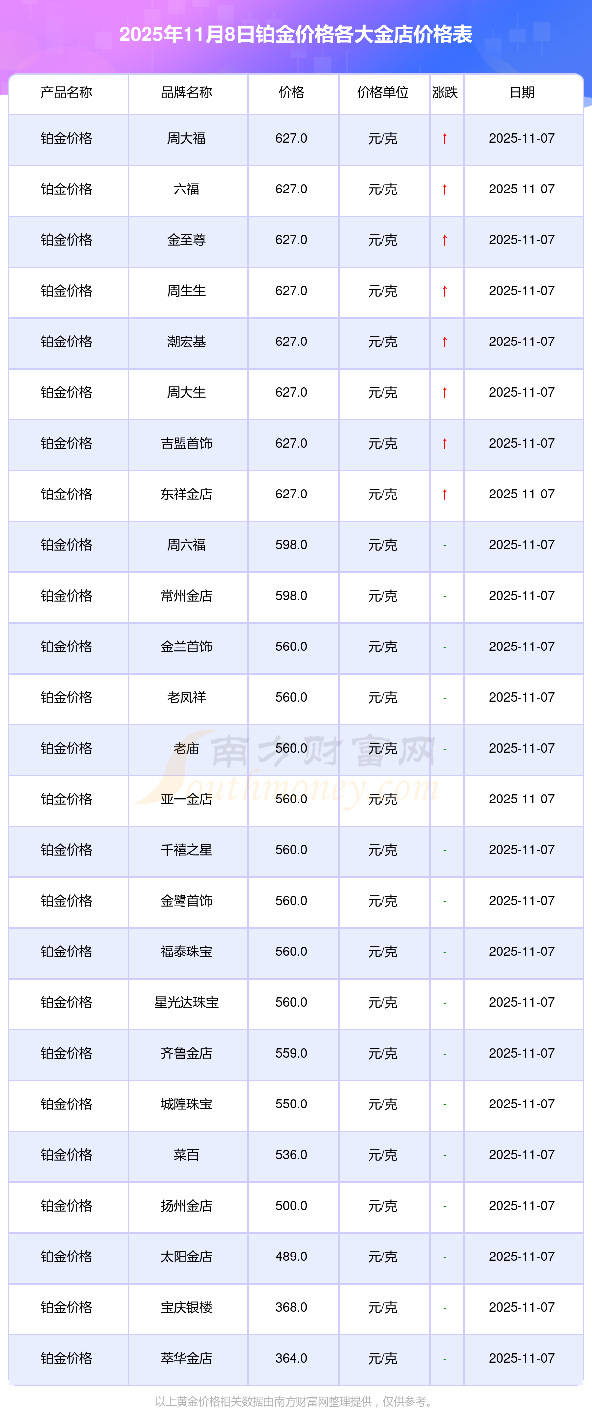 2025年11月8日寶泉錢幣、金蘭首飾、金蘭首飾、謝瑞麟、謝瑞麟、謝瑞麟、謝瑞麟、謝瑞麟、金銀街、金銀街、金銀街等各大金店品牌鉑金價格最新價格如下:寶泉錢幣銀條價格11.4元/克,金蘭首飾黃金價格1263.0元/克,金蘭首飾鉑金價格560.0元/克,謝瑞麟金條價格(內(nèi)地)1202.0元/克,謝瑞麟金飾價格(內(nèi)地)1268.0元/克,謝瑞麟黃金飾品(香港)44260.0,謝瑞麟鉑金飾品(香港)13080.0,謝瑞麟金條金價(香港)39960.0,金銀街投資金條1243.0元/克,金銀街工藝金條1258.0元/克,金銀街千足金首飾1248.0元/克。