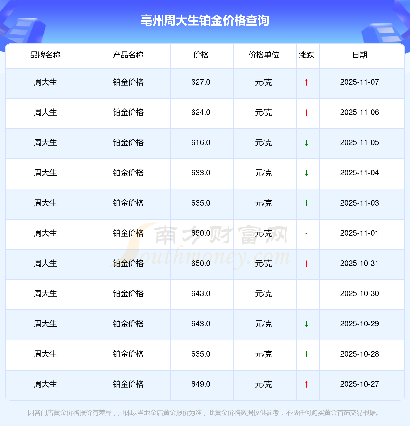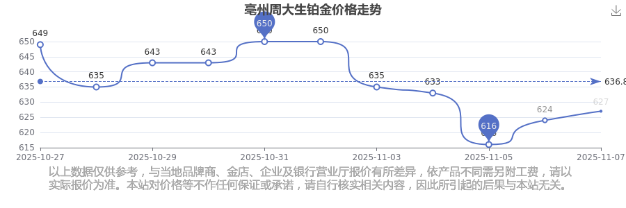 2025年11月8日,亳州周大生所售鉑金價格,其價格設定為 627.0元/克。