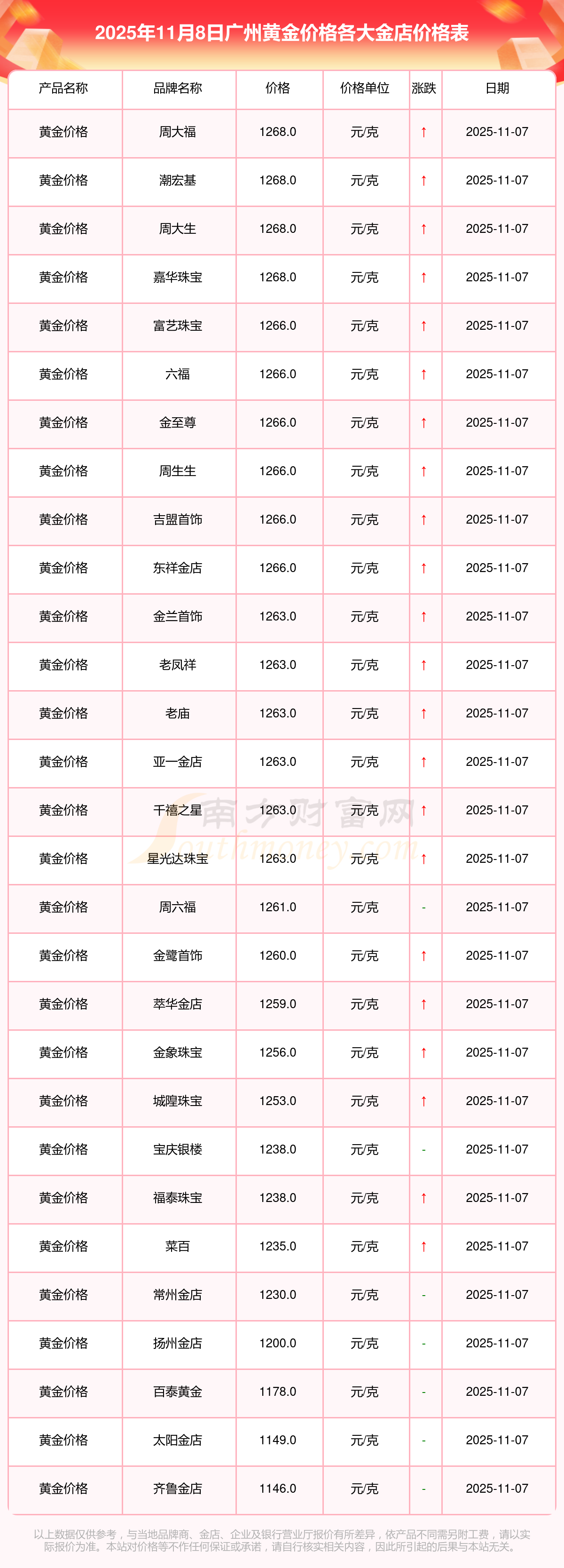 今天是2025年11月8日,廣州寶泉錢(qián)幣、金蘭首飾、金蘭首飾、謝瑞麟、謝瑞麟、謝瑞麟、謝瑞麟、謝瑞麟、金銀街、金銀街、金銀街等各大金店品牌黃金價(jià)格最新價(jià)格行情是這樣的:寶泉錢(qián)幣11.4元/克、金蘭首飾1263.0元/克、金蘭首飾560.0元/克、謝瑞麟1202.0元/克、謝瑞麟1268.0元/克、謝瑞麟44260.0、謝瑞麟13080.0、謝瑞麟39960.0、金銀街1243.0元/克、金銀街1258.0元/克、金銀街1248.0元/克。