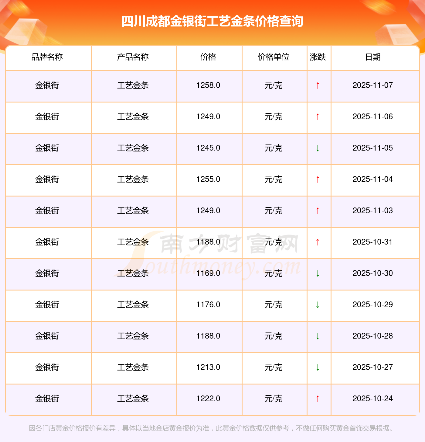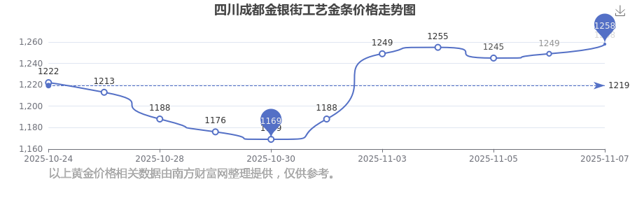 今日四川成都金銀街工藝金條價格為1258.0元/克。