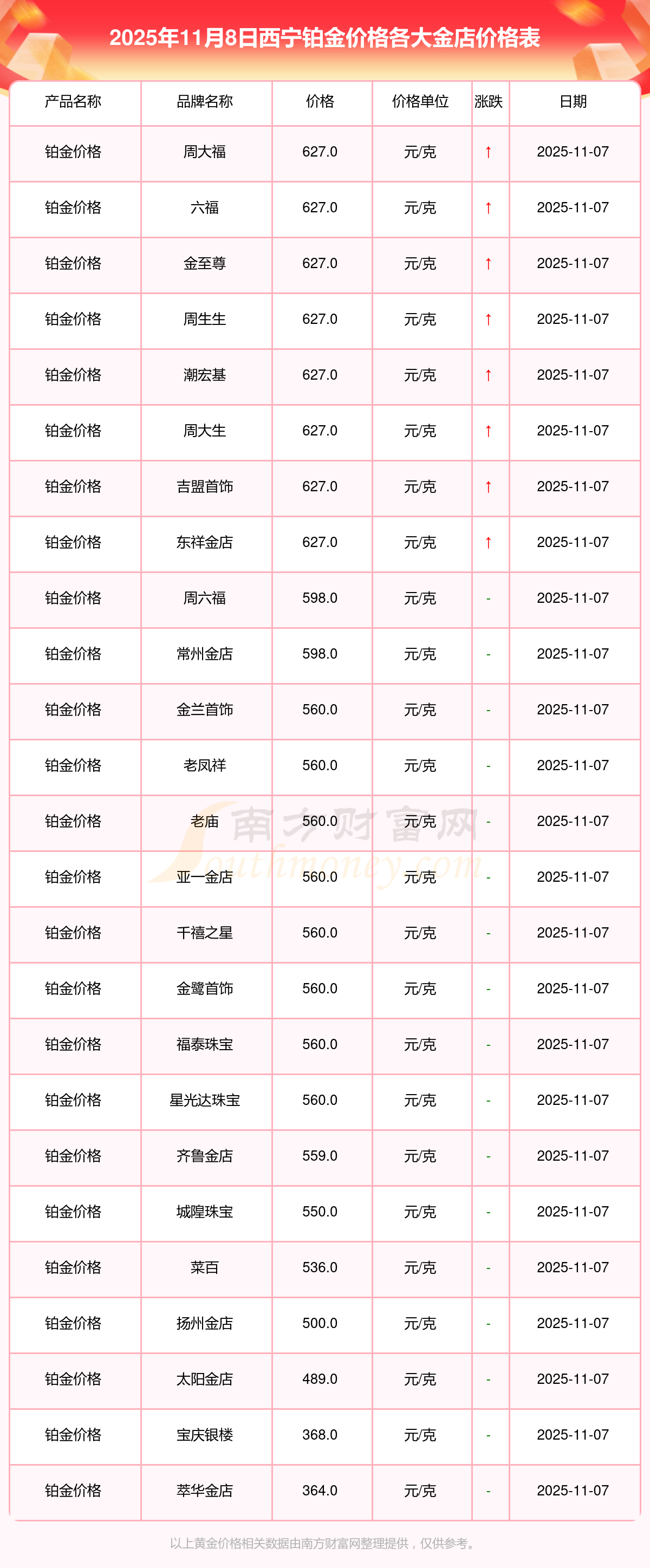 2025年11月8日西寧寶泉錢幣、金蘭首飾、金蘭首飾、謝瑞麟、謝瑞麟、謝瑞麟、謝瑞麟、謝瑞麟、金銀街、金銀街、金銀街等各大金店品牌鉑金價格最新價格如下:寶泉錢幣銀條價格11.4元/克,金蘭首飾黃金價格1263.0元/克,金蘭首飾鉑金價格560.0元/克,謝瑞麟金條價格(內地)1202.0元/克,謝瑞麟金飾價格(內地)1268.0元/克,謝瑞麟黃金飾品(香港)44260.0,謝瑞麟鉑金飾品(香港)13080.0,謝瑞麟金條金價(香港)39960.0,金銀街投資金條1243.0元/克,金銀街工藝金條1258.0元/克,金銀街千足金首飾1248.0元/克。