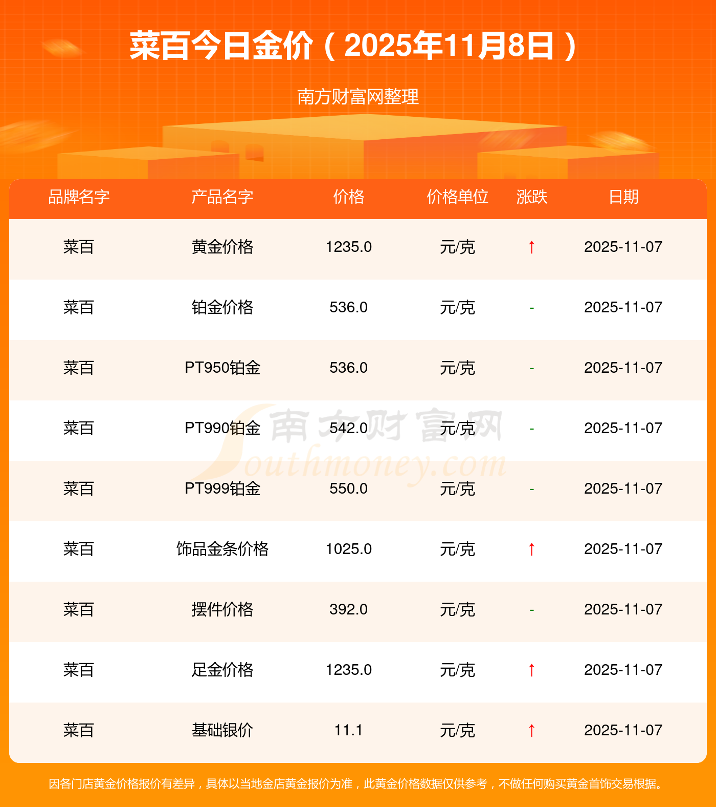 以上數(shù)據(jù)僅供參考,與當(dāng)?shù)亟鸬暧兴町悾?qǐng)以實(shí)際價(jià)格為準(zhǔn)。
