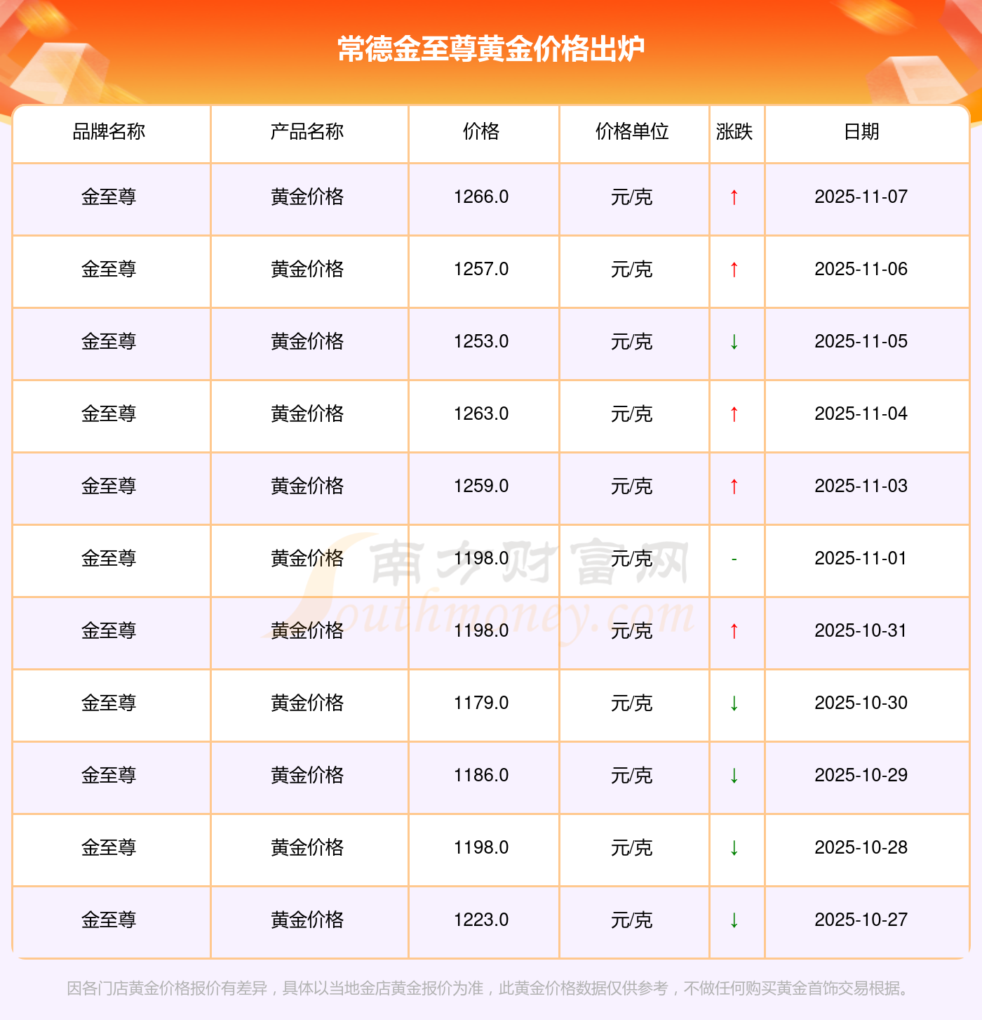 今日(2025年11月8日)常德金至尊黃金價(jià)格:1266.0元/克。