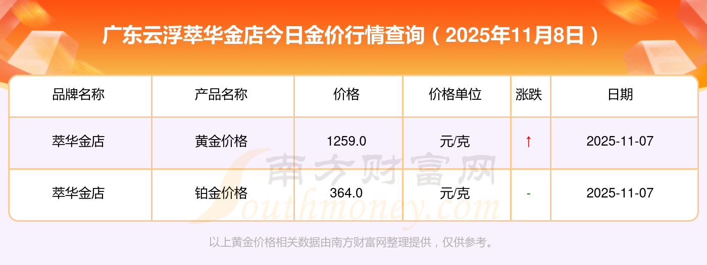 2025年11月8日廣東云浮萃華金店一克黃金的售價(jià)是多少:銀條價(jià)格11.4元/克,黃金價(jià)格1263.0元/克,鉑金價(jià)格560.0元/克,金條價(jià)格(內(nèi)地)1202.0元/克,金飾價(jià)格(內(nèi)地)1268.0元/克,黃金飾品(香港)44260.0,鉑金飾品(香港)13080.0,金條金價(jià)(香港)39960.0,投資金條1243.0元/克,工藝金條1258.0元/克,千足金首飾1248.0元/克。