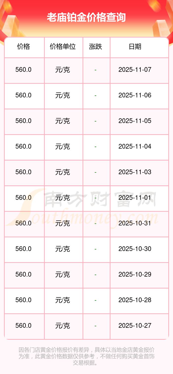 2025年11月8日老廟鉑金價格是560.0元/克。