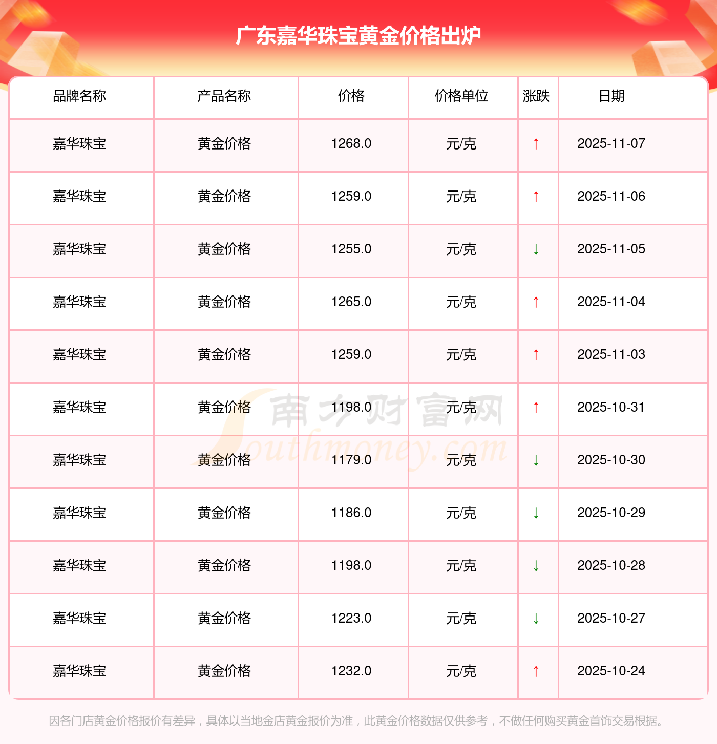 今日廣東嘉華珠寶黃金價(jià)格是1268.0元/克。