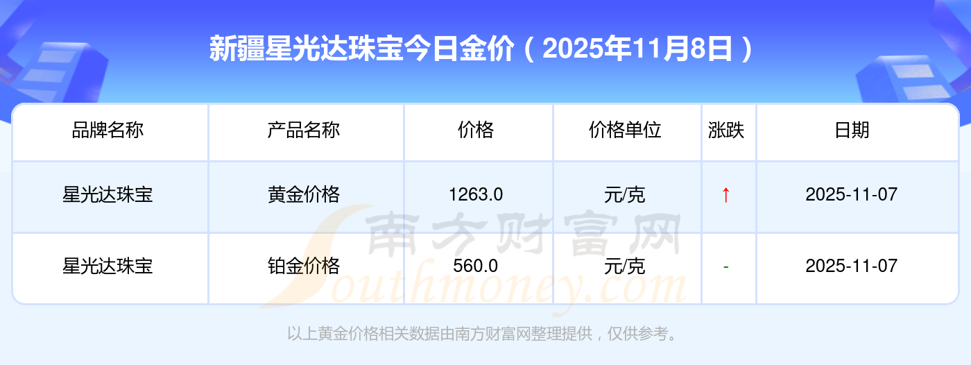 今日黃金價(jià)格情況如何?此刻黃金一克要多少錢(qián)?2025年11月8日新疆星光達(dá)珠寶黃金按克計(jì)價(jià),現(xiàn)在多少錢(qián)一克?銀條價(jià)格11.4元/克,黃金價(jià)格1263.0元/克,鉑金價(jià)格560.0元/克,金條價(jià)格(內(nèi)地)1202.0元/克,金飾價(jià)格(內(nèi)地)1268.0元/克,黃金飾品(香港)44260.0,鉑金飾品(香港)13080.0,金條金價(jià)(香港)39960.0,投資金條1243.0元/克,工藝金條1258.0元/克,千足金首飾1248.0元/克。