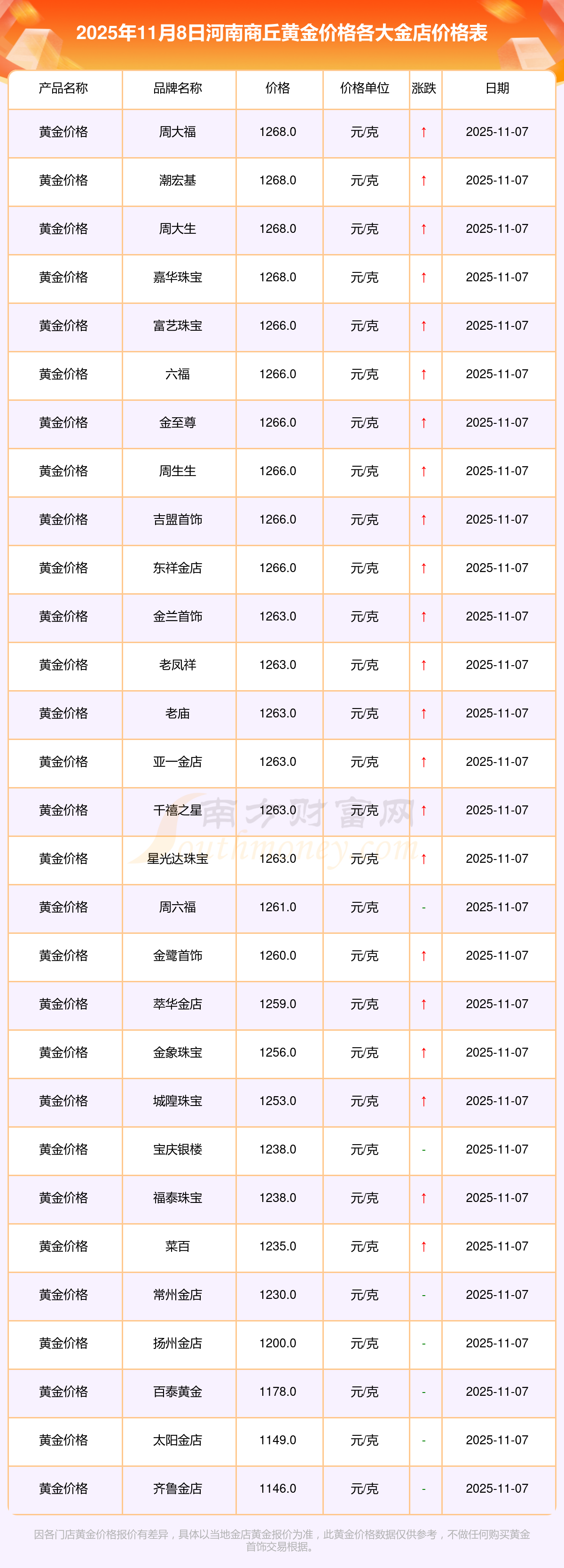 2025年11月8日河南商丘各金店黃金價(jià)格是多少錢(qián)一克?各金店黃金價(jià)格表