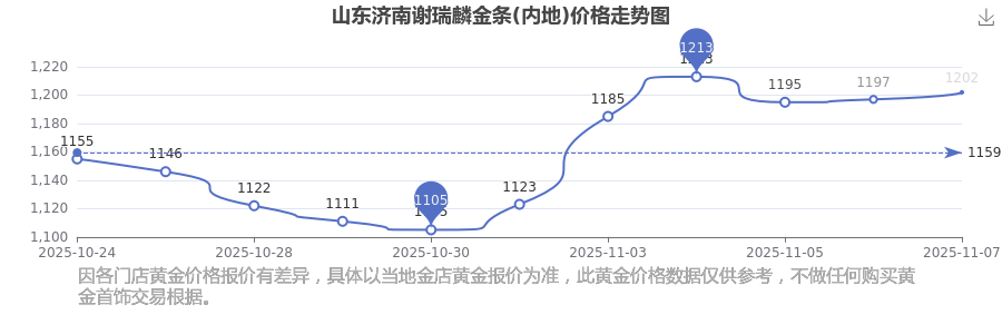 2025年11月8日,山東濟南謝瑞麟的金條價格(內(nèi)地)標價達到 1202.0元/克。